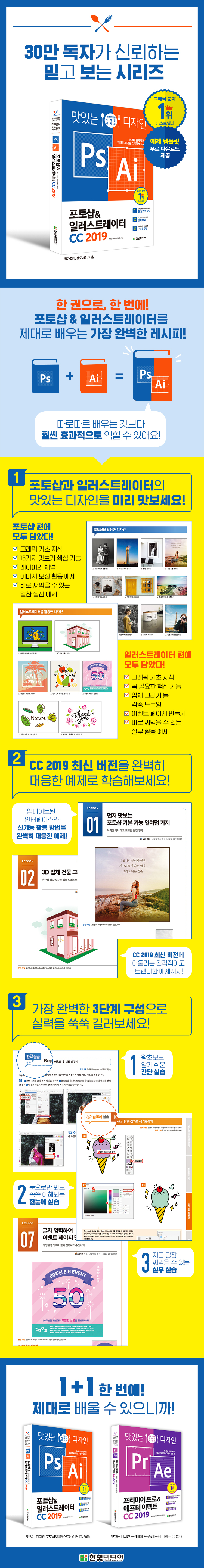 그래픽 디자인에 꼭 필요한 포토샵과 일러스트레이터를 한 번에, 그리고 가볍게 배울 수 있습니다. 핵심만 골라 담아 부담 없이 학습할 수 있으며, 따로따로 배우는 것보다 효과적으로 익힐 수 있습니다. 가장 최신 버전인 CC 2019에 완벽히 대응하여 기초 기능은 물론이고 핵심 기능과 CC 2019 버전의 신기능까지 더 빠르고 쉽게 배울 수 있습니다. 기본부터 활용법까지 완벽하게 마스터할 수 있는 3단계 학습 방법인 [기능 실습] – [한눈에 실습] – [실무 실습]의 3단계 구성은 누구나 포토샵과 일러스트레이터를 제대로 배워 바로 써먹을 수 있도록 도와줍니다.