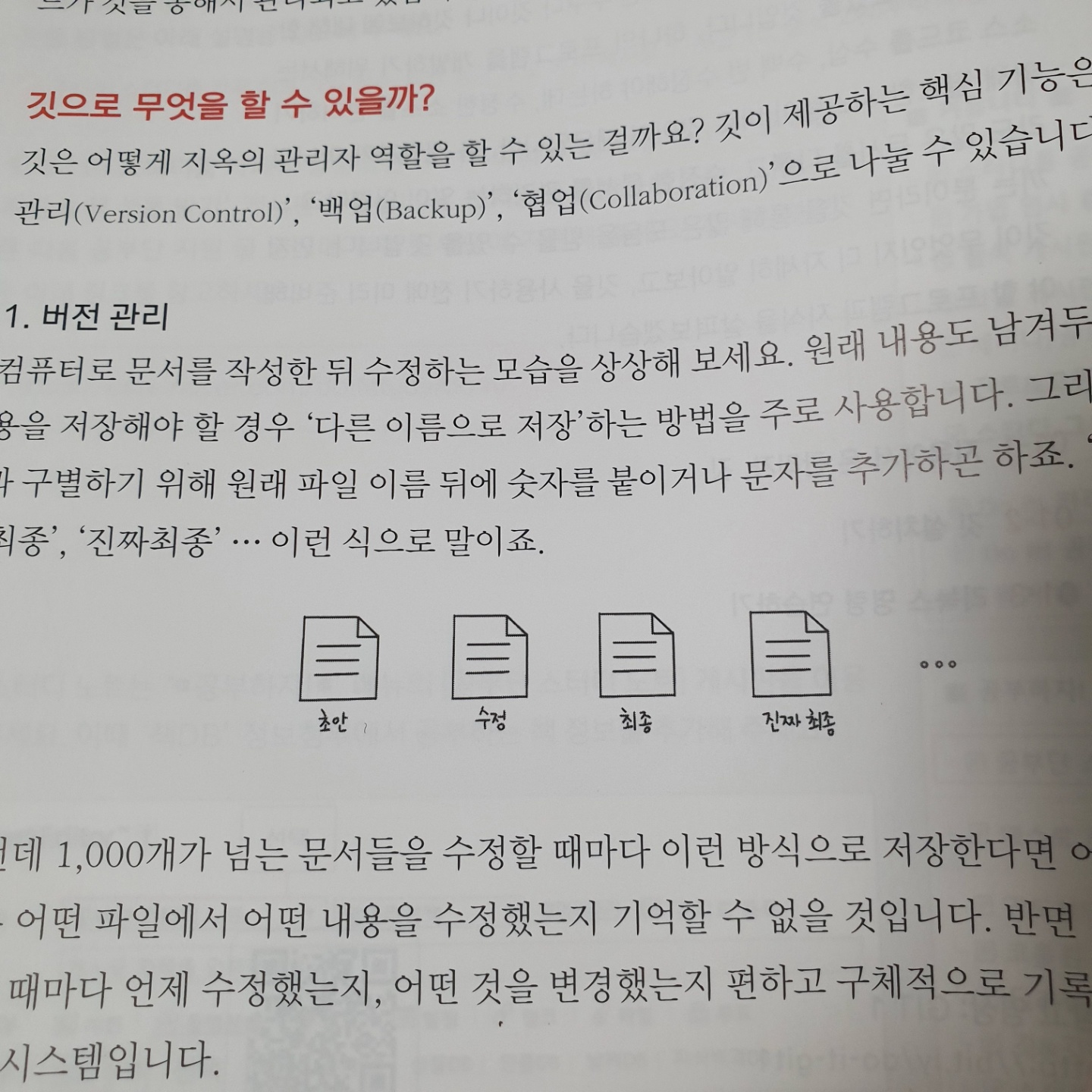 기존에는 개발소스를 관리할 때 최종... 최종2... 진짜 최종 등으로 문자를 늘려가곤 했었습니다. v1.0, v1.2등으로 버전을 표시하기도 하고 압축을 통해서 소스코드를 관리했습니다. 하지만 깃을 사용하면 이런 부분들에 있어서 굉장히 많인 이득을 얻을 수 있습니다. 깃을 통해 관리/백업/협업을 할 수 있도록 책을 통해 공부해보시는건 어떨까요?