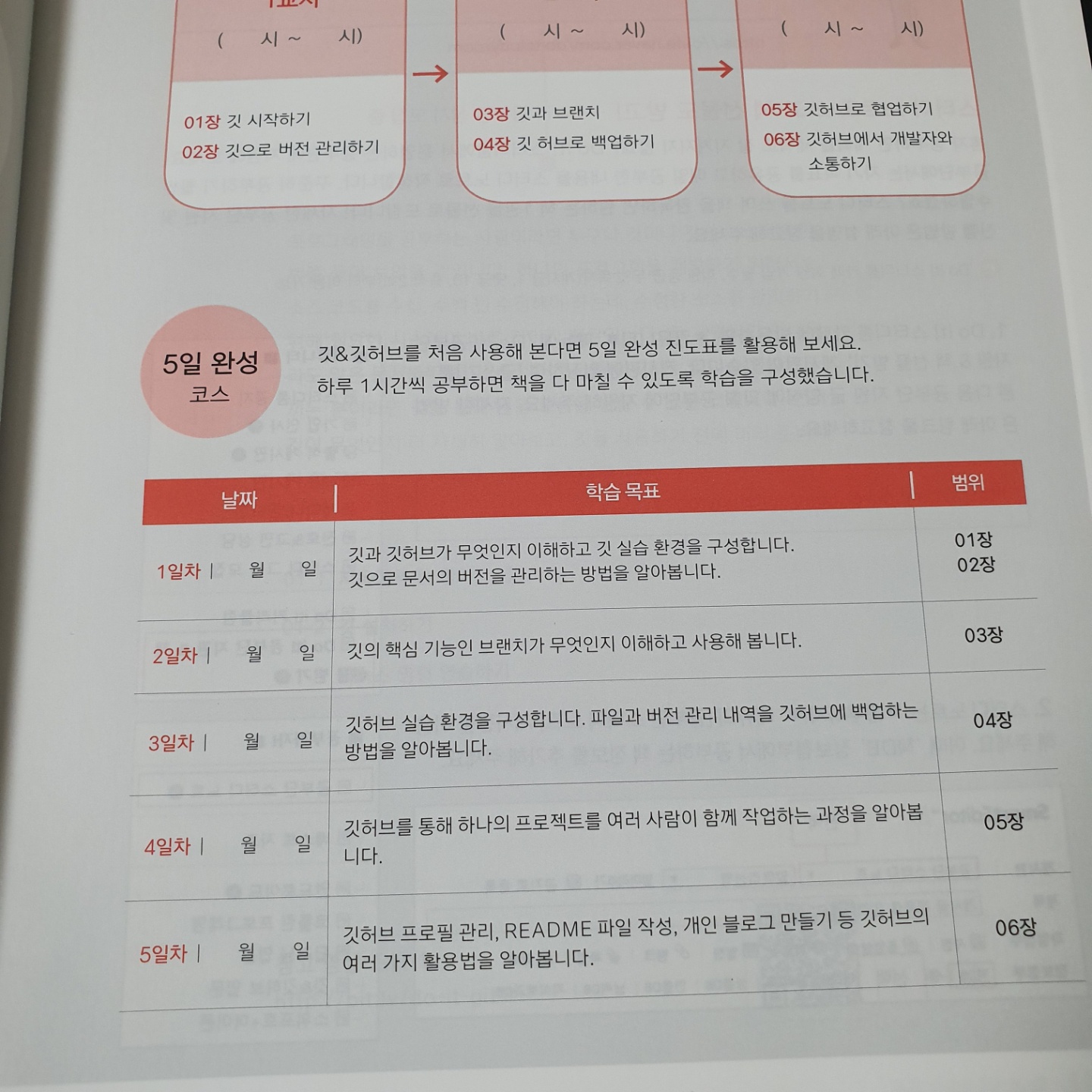 최근 이지스퍼블리싱에서 출판 되는 책들은 Do it!이라는 내용들이 포함되어 있고, 일정도 정해서 공부할 수 있도록 제공하고 있었습니다. 플래너 느낌으로 공부를 할 수 있다는 점이 좋은 것 같습니다. 하루에 1시간 공부해서 5일정도의 시간으로 책을 끝내는 코스로 구성되어 있습니다. 기존에 깃과 깃허브 내용에 알고 있는 부분들이 있어서 하루 2시간을 투자해서 책을 다 읽을 수 있었습니다. 간단하지만 책 내용은 정말 마음에 듭니다.