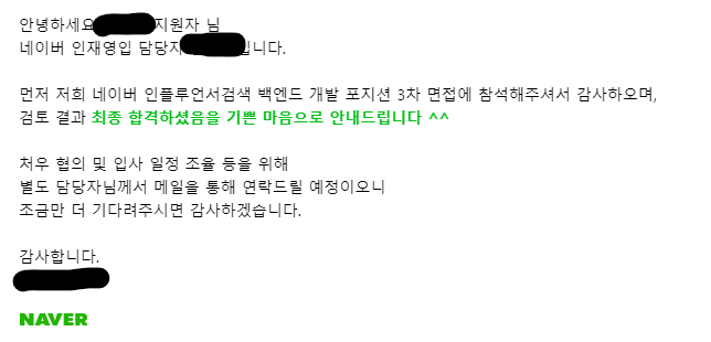 서류 전형 합격에 대한 내용은 유선상으로 전달 받았다. 네이버는 공채보다는 수시채용 느낌이 강하다고 생각된다.