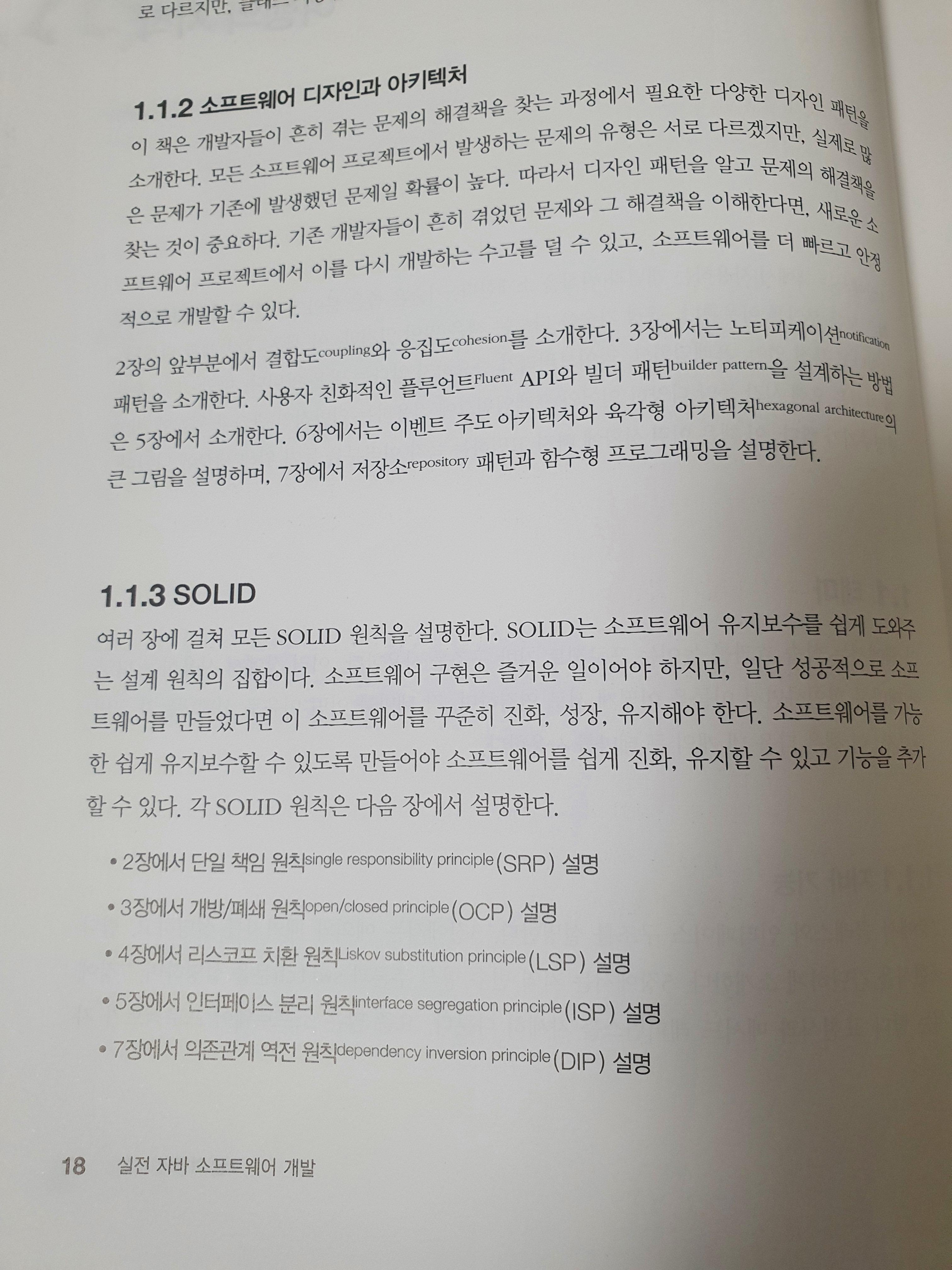 책에서는 모든 장에 걸쳐 SOLID 원칙을 설명합니다.