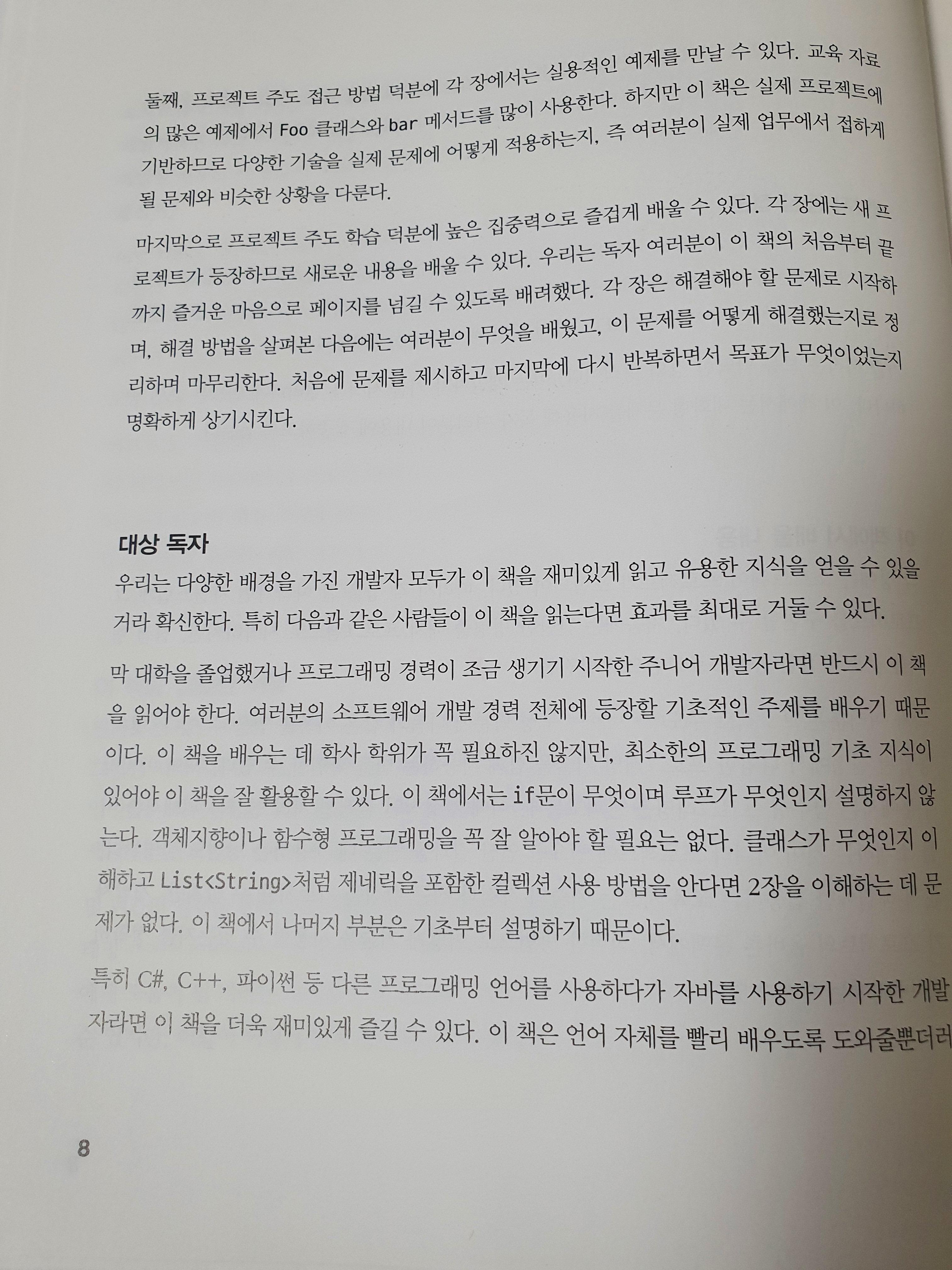 이 책의 대상 독자는 어느정도 프로그래밍에 대한 경험이 있는 사람을 대상으로 합니다. 책에서는 if문에 대해서 설명하고 있지 않기 때문에 대학교를 졸업하는 시점, 프로그래밍 경력이 얼마되지 않았지만 존재하는 개발자를 대상으로 하고 있는 것 같습니다.