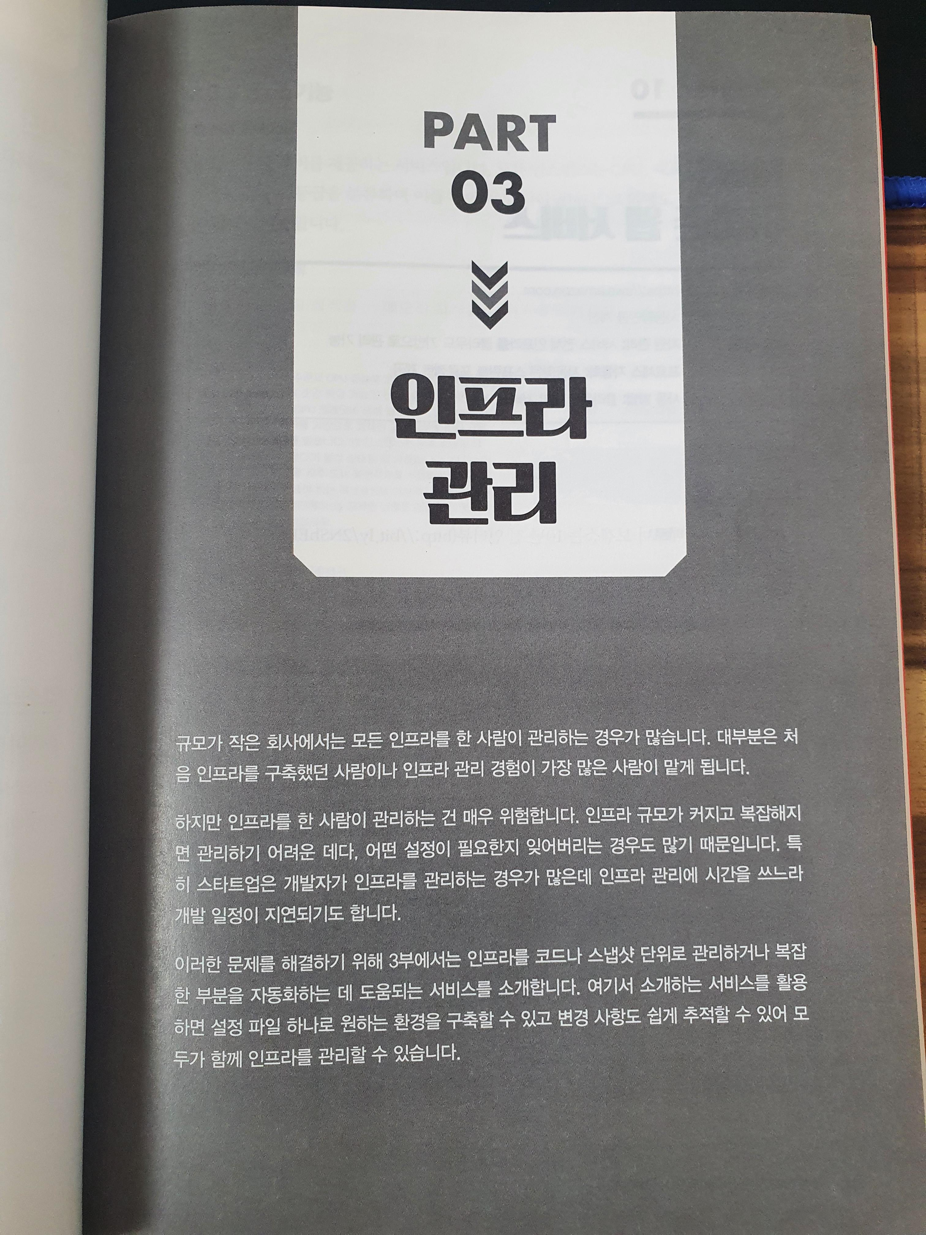 Part3 부터는 인프라 관리에 대한 내용이 나옵니다. 아마존, 도커, 앤서블 등 인프라에 사용되는 서비스들이 나옵니다. 저는 주로 도커를 많이 사용해서 쓰고 있고, 사내에는 자체 IaaS가 있기 때문에 아마존 서비스에 대해서 신경 쓸 일이 없었는데 책을 통해 정보를 얻을 수 있어서 좋았습니다.