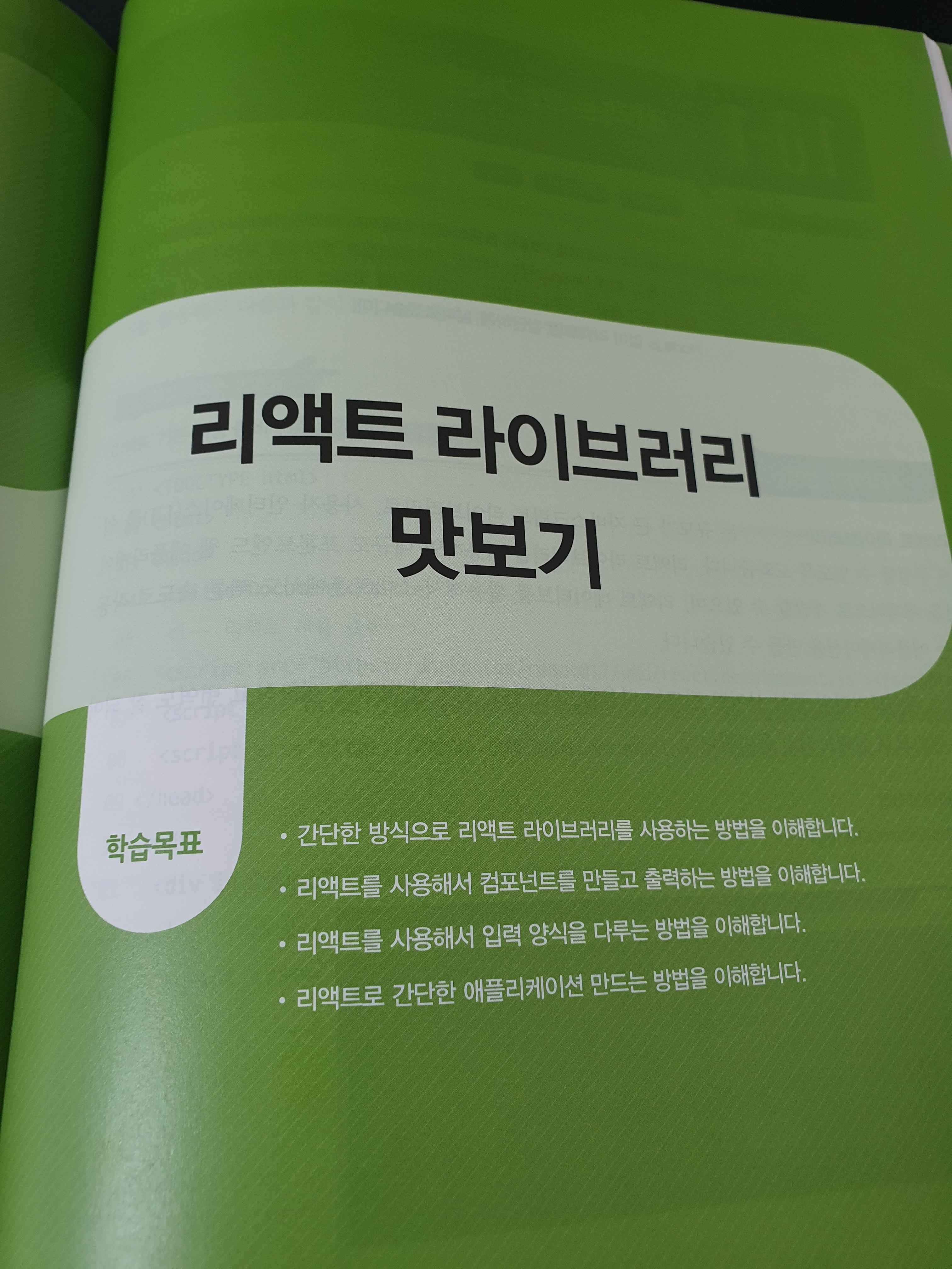 기본적인 내용들을 지나고 나면 리액트 맛보기가 나옵니다. 리액트 맛만보기 인데요. 자바스크립트만 놓고보면 원하는것을 만들기에 시간이 많이 소요될 때가 많습니다. 그럴 때 우리는 라이브러를 찾아서 쓰게 되는데요. 대표적인 라이브러리가 리액트입니다. 사용자 인터페이스, 즉 UI를 만들기 위해 사용하는 라이브러리입니다.