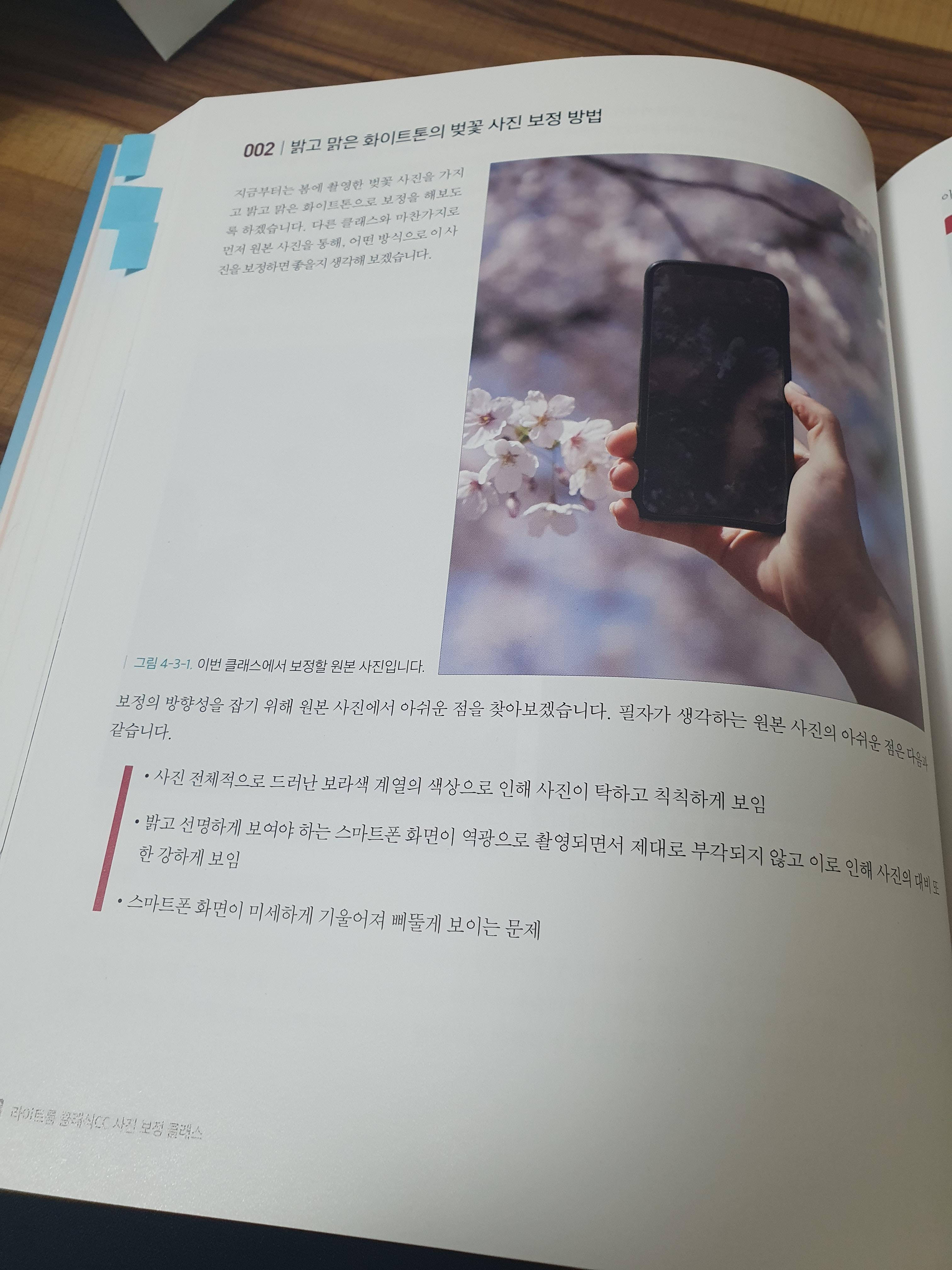그렇기 때문에 사진을 찍는 법과 보정하는 법, 두 가지를 알려줌으로써 더 좋은 결과를 만들 수 있도록 도와주는 책입니다.