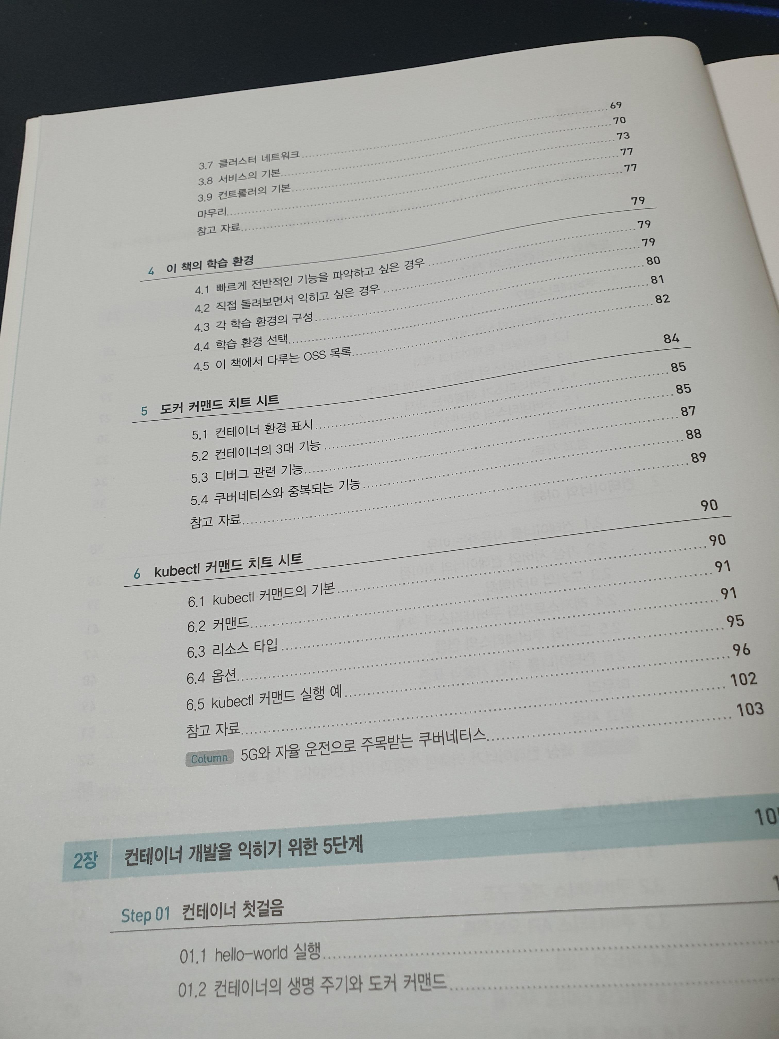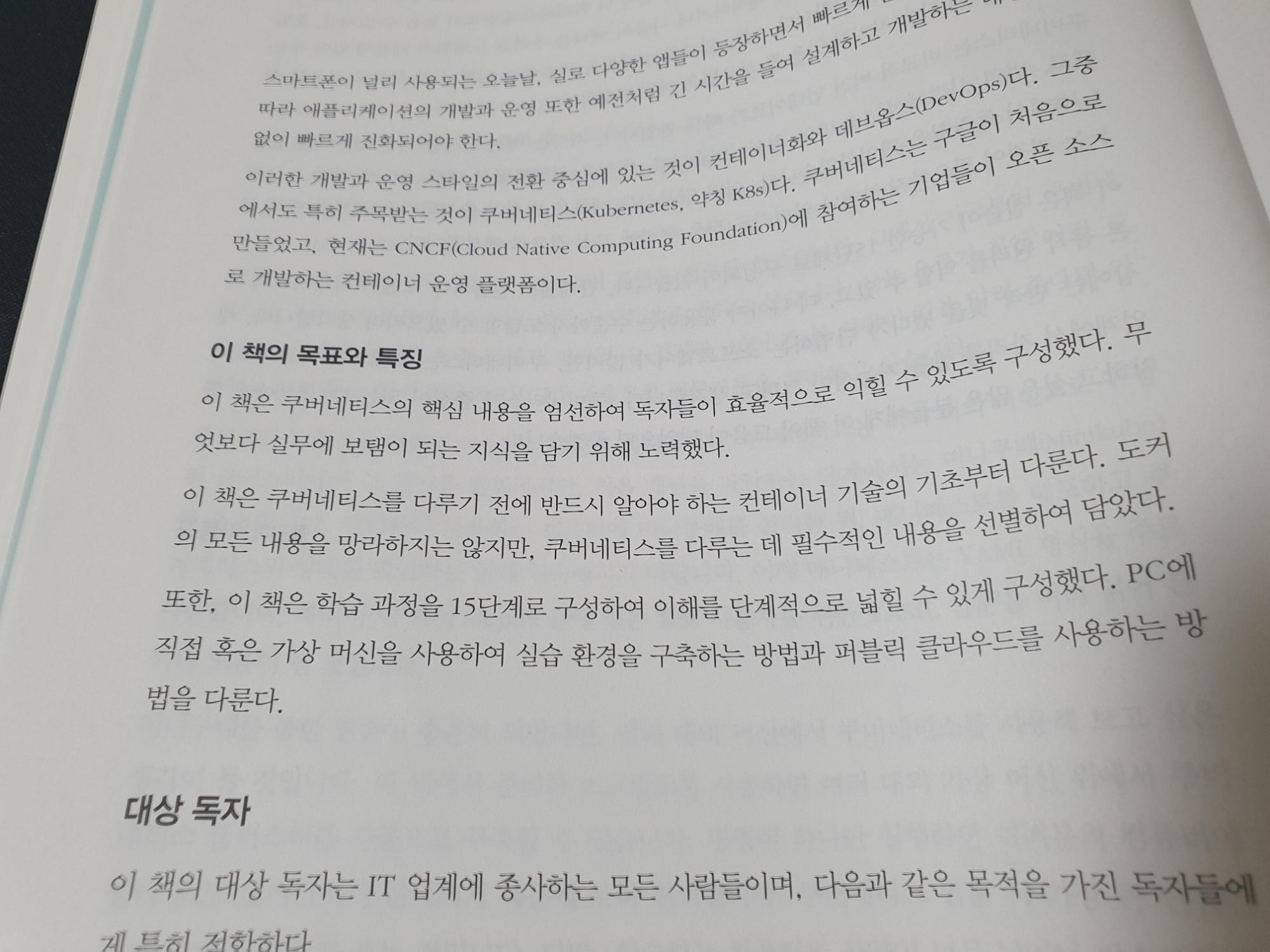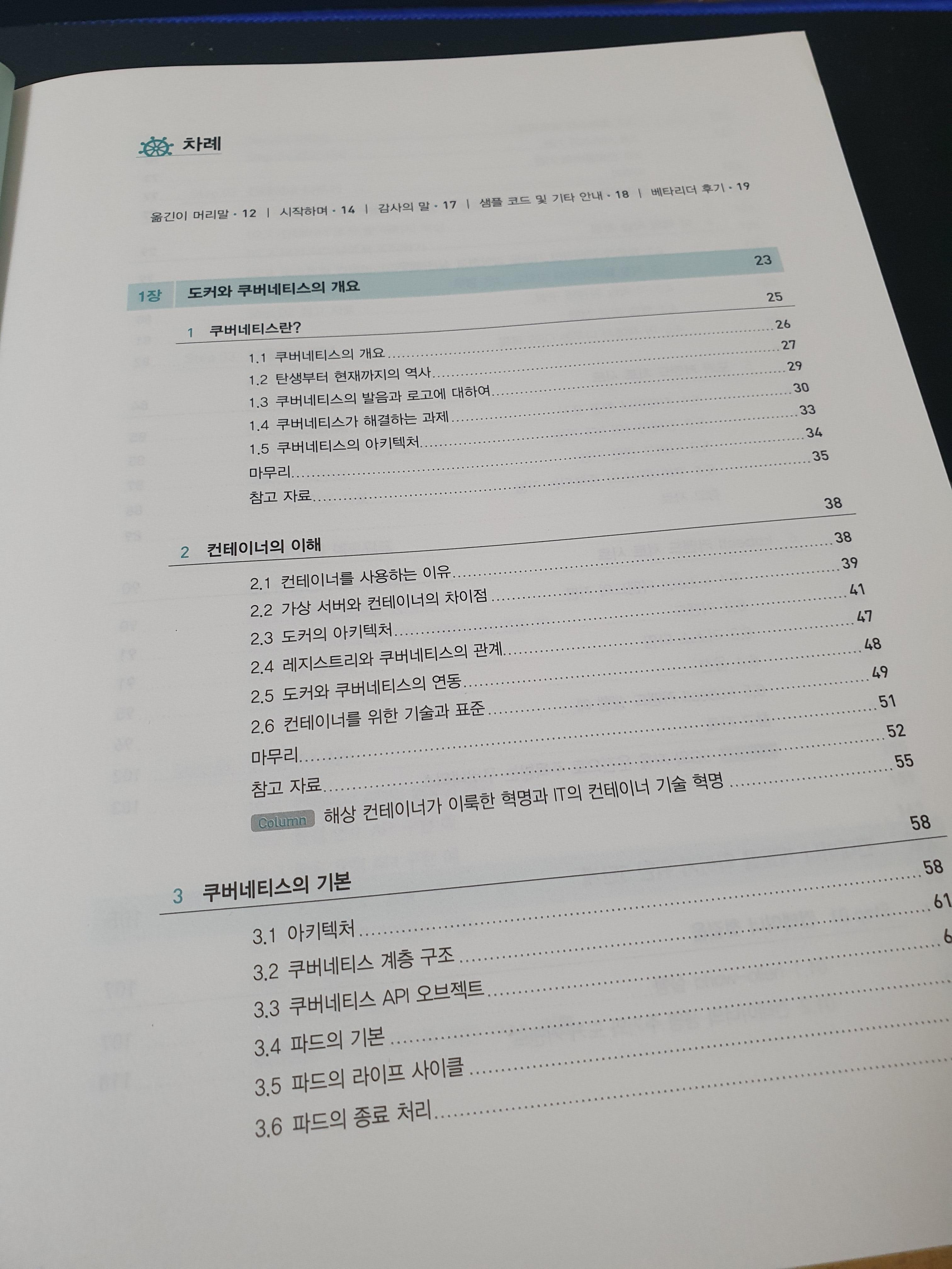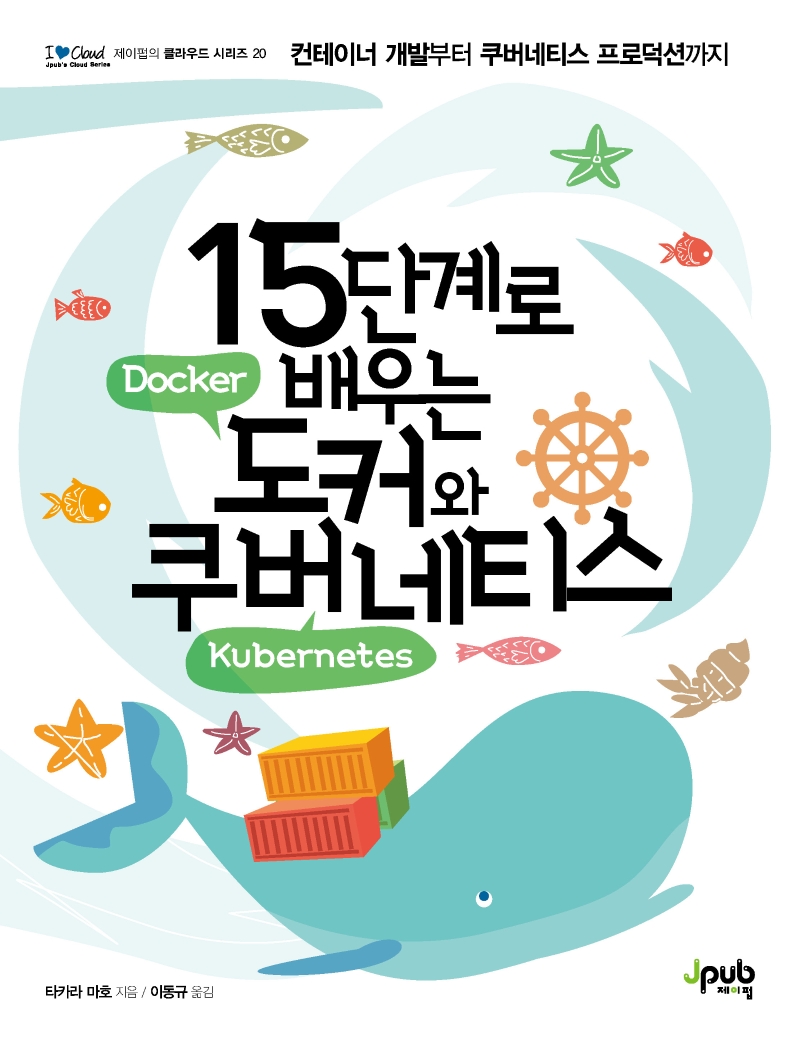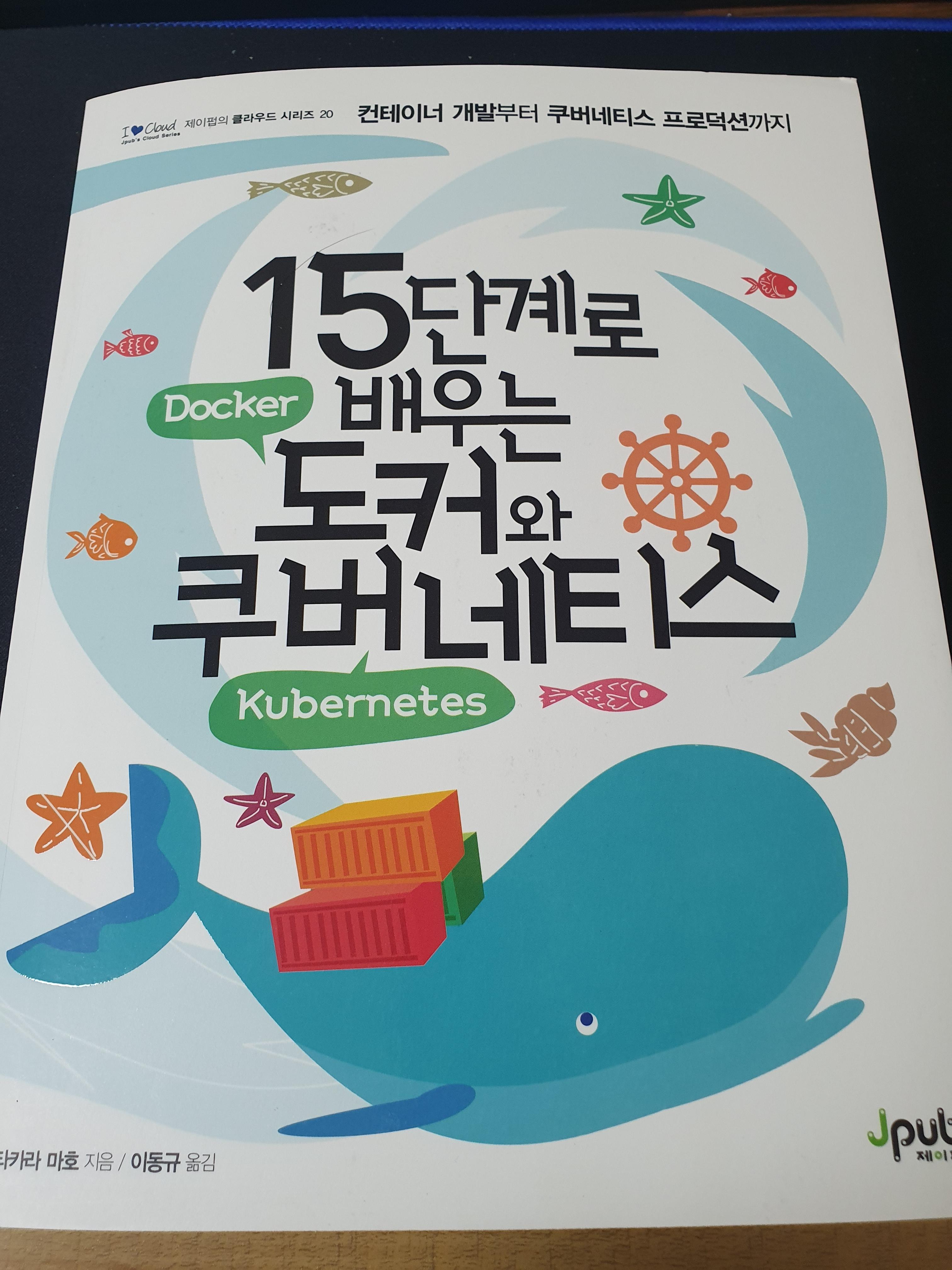 책이 상당히 귀엽습니다. 도커(Docker)를 상징하는 고래와 쿠버네티스 문양도 보이네요. 15단계를 통해 쿠버네티스를 설명한다고 하니 한번 확인해보겠습니다.