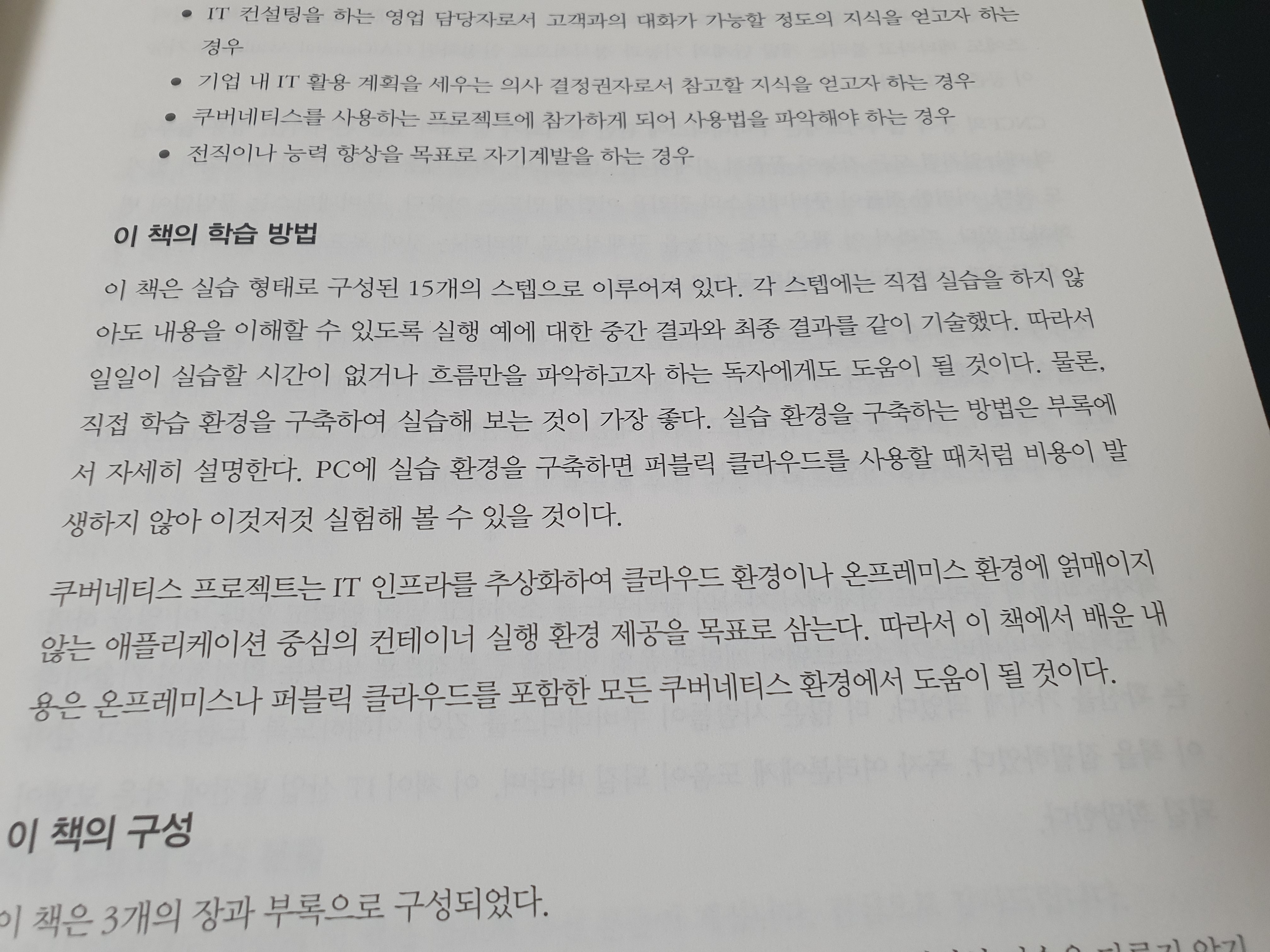 책의 목표는 쿠버네티스를 효율적으로 익힐 수 있도록 하는 것이고, 실무에 보탬이 되도록 하는 것을 목표로 하고 있습니다. 15단계의 단계로 나눠 쿠버네티스를 배우게 됩니다. 책 앞에서 나와 있는 학습 목표에는 배운 내용을 토대로 온프레미스나 퍼블릭 클라우드를 포함한 모든 쿠버네티스 환경을 이해하는데 도움이 되지 않을까 생각됩니다.