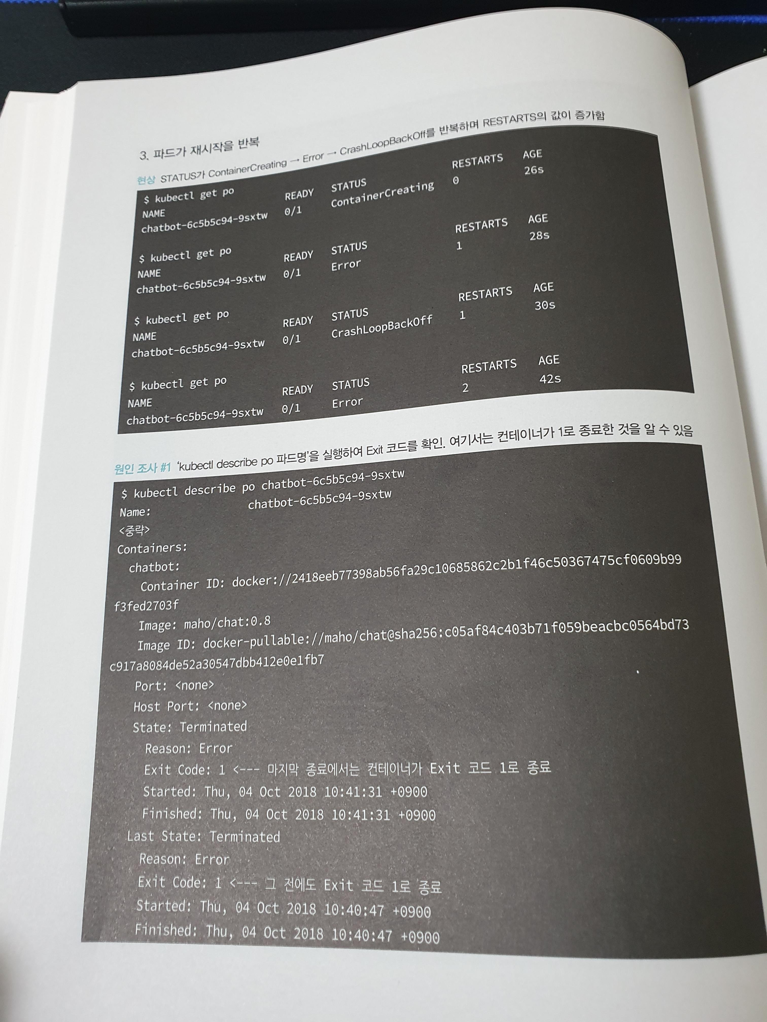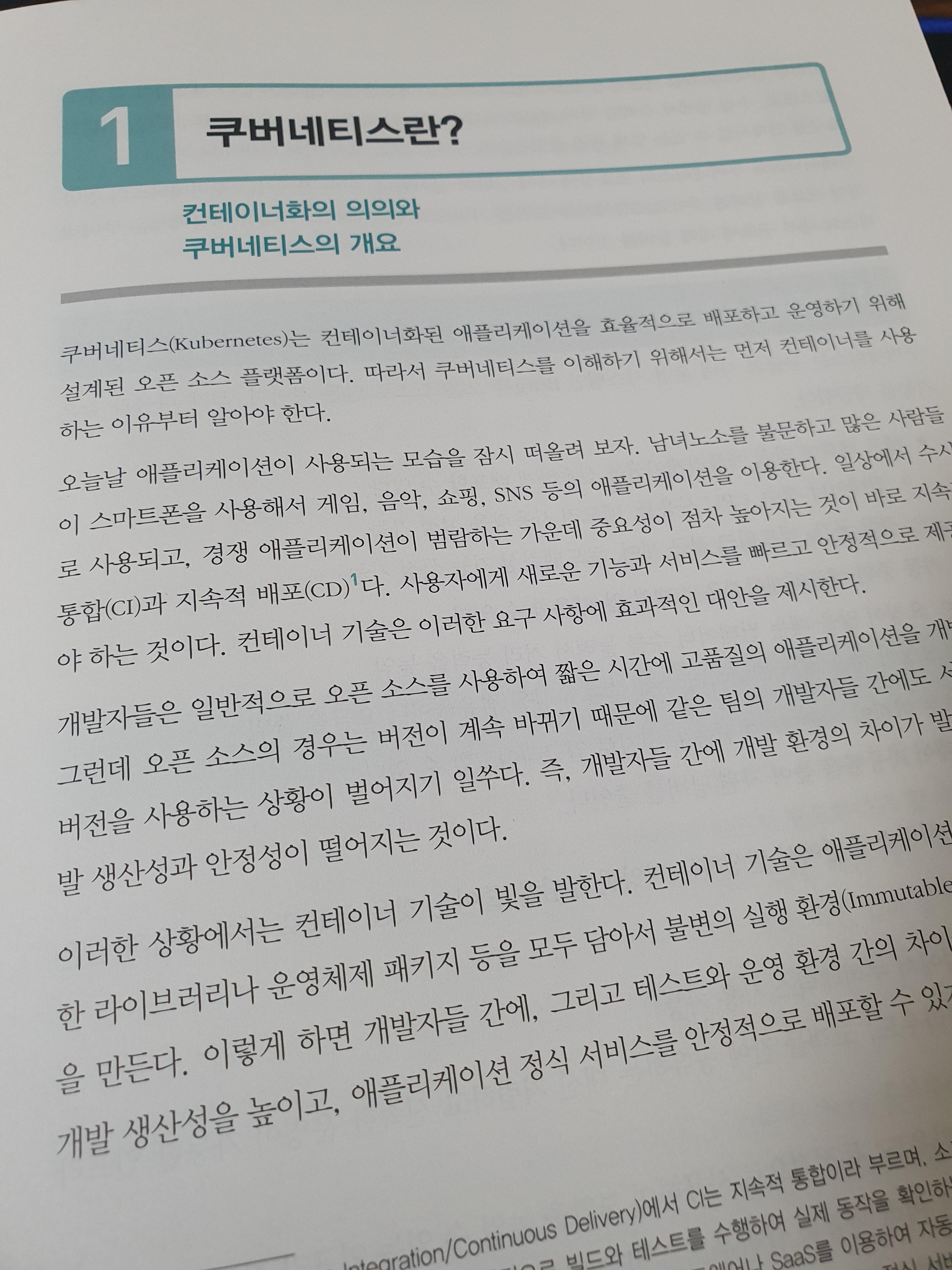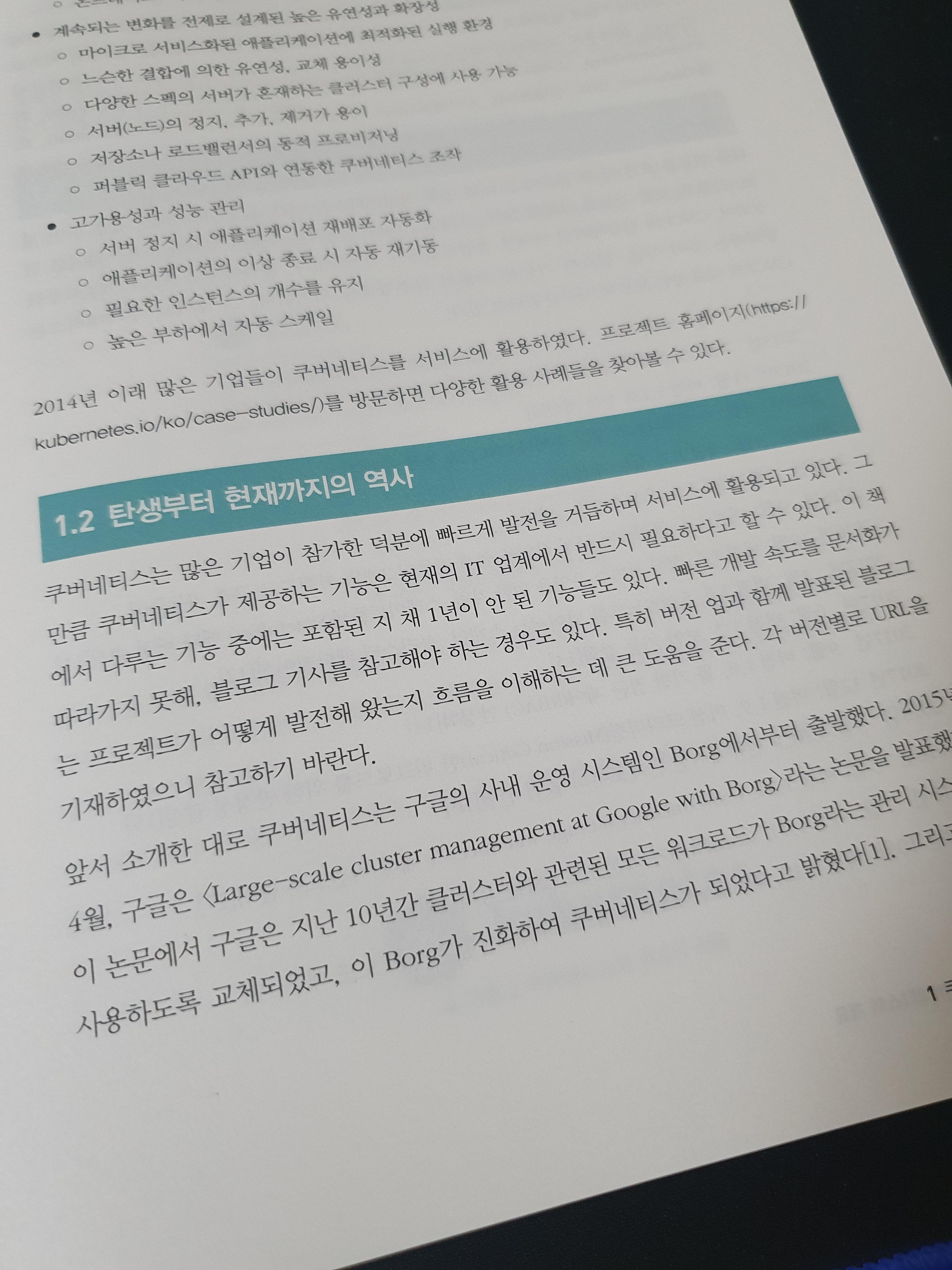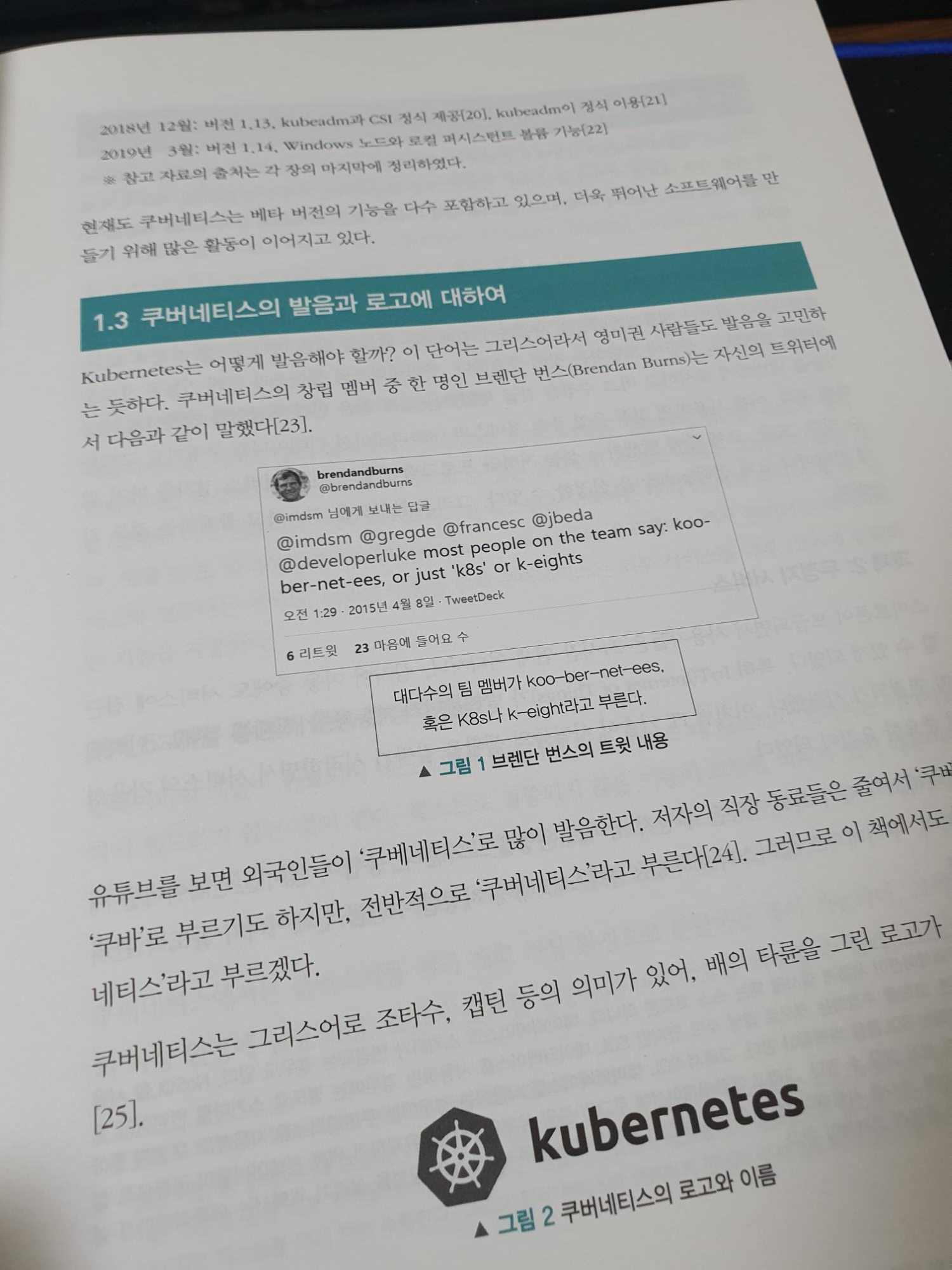 쿠버네티스란 무엇일까요? 첫장에서는 쿠버네티스와 도커에 대한 간단한 설명이 있었습니다. 이름과 로고에 대한 내용도 나오고 왜 사용하는지 등에 대한 설명을 제공하고 있습니다. 쿠버네티스는 k8s라고도 표한하는데 kubernetes, k와 s사이에 8개의 알파벳이 있어서 저렇게 표현한다고 하네요.