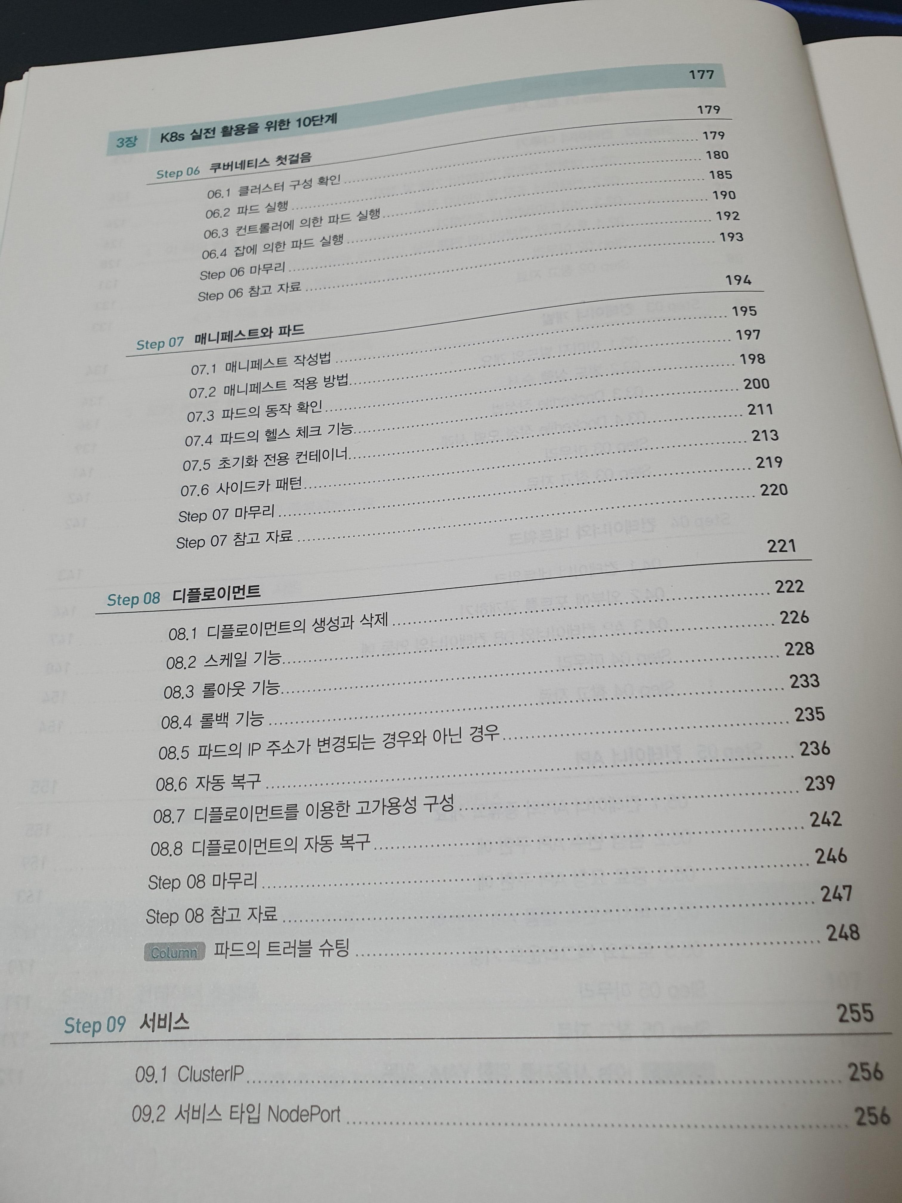책의 목차는 총 15장으로 되어있습니다. 15단계라는게 15장을 의미하는것 같네요. 기초적인 내용부터 차근차근 진행되는 것을 목차로 확인 할 수 있었습니다. 쿠버네티스 환경을 구축하기 위해 미니도커를 많이 활용하는데요. 학습 환경 구축은 부록에 나와 있으니 참고해서 환경을 구축하면 될 것 같습니다. 저는 이미 미니쿠버가 구축되어 있어서 별도로 구축하지는 않았습니다. 윈도우 같은 경우도 설명되어 있습니다. 최근 WSL을 통해 도커와 쿠버네티스 환경을 구축할 수 있으니 큰 걱정 없이 학습환경을 구축할 수 있었습니다.