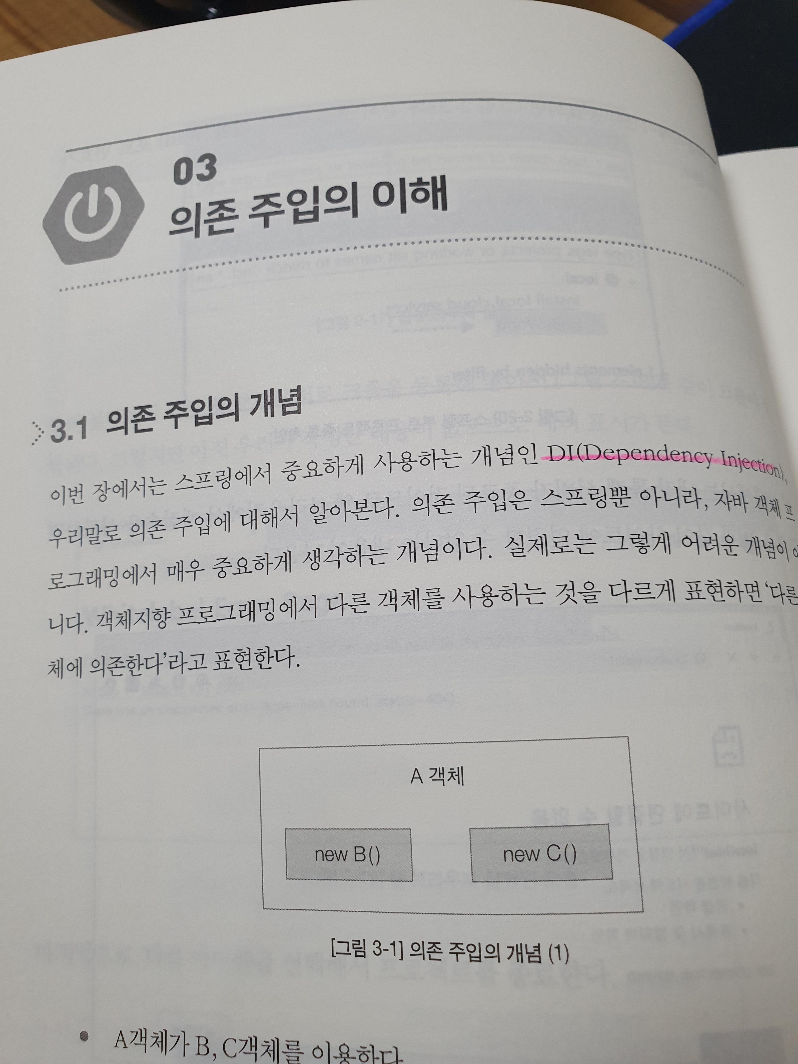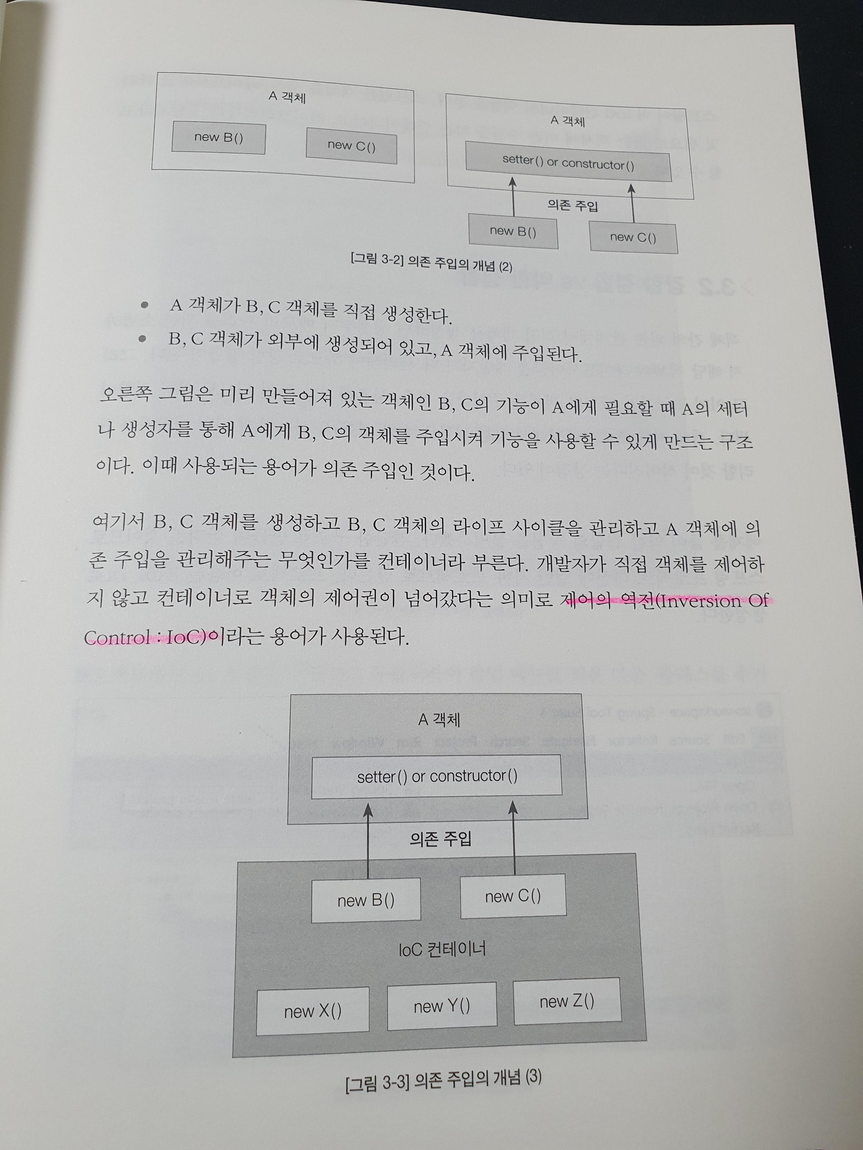 스프링을 공부한다고 했을 때 DI(Dependency Injection) 과 IoC(Inversion of Control)을 빼놓을 수 없는데요. 책에서도 이런 내용들을 다루어지고 있습니다. DI와 IoC가 간단하게 설명되어 있는 것 같지만 그만큼 어렵지 않게 설명했다는 것을 알 수 있습니다. 자세한 내용은 책을 참고하시면 될 것 같습니다.
