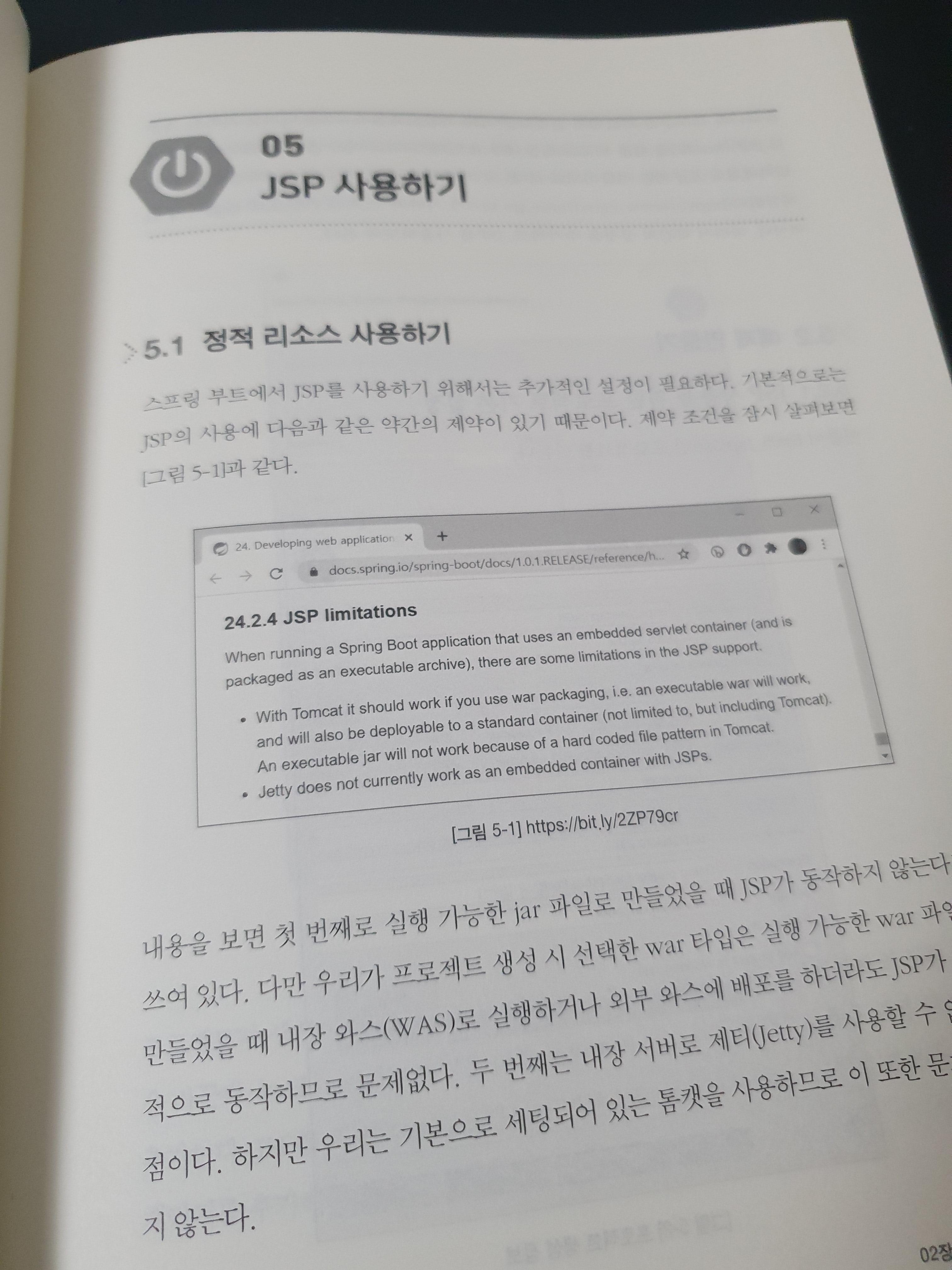 또한 JSP에 대한 설명도 볼 수 있습니다. Spring Boot에서는 사실 JSP에 대핸 지원을 섬세하게 하지 않기 때문에 HTML을 이용해서 작업하면 어땠을까? 라는 생각을 해보기도 했습니다. 다만 이 책은 JSP, Oracle, MyBatis에 중점을 두고 있기 때문에 다른 Spring Boot 책에서는 설명하지 않는 내용들을 배울 수 있다는게 포인트 입니다. 스프링 책이 많아지고 JSP를 사용하지 않게 되면서 많은 책들이 JSP에 대한 설명을 하고 있지 않습니다. 그런 부분에 있어서는 JSP 예제를 통해서 나마 JSP를 접해 볼 수 있는 기회가 주워진다는 점이 좋았습니다.