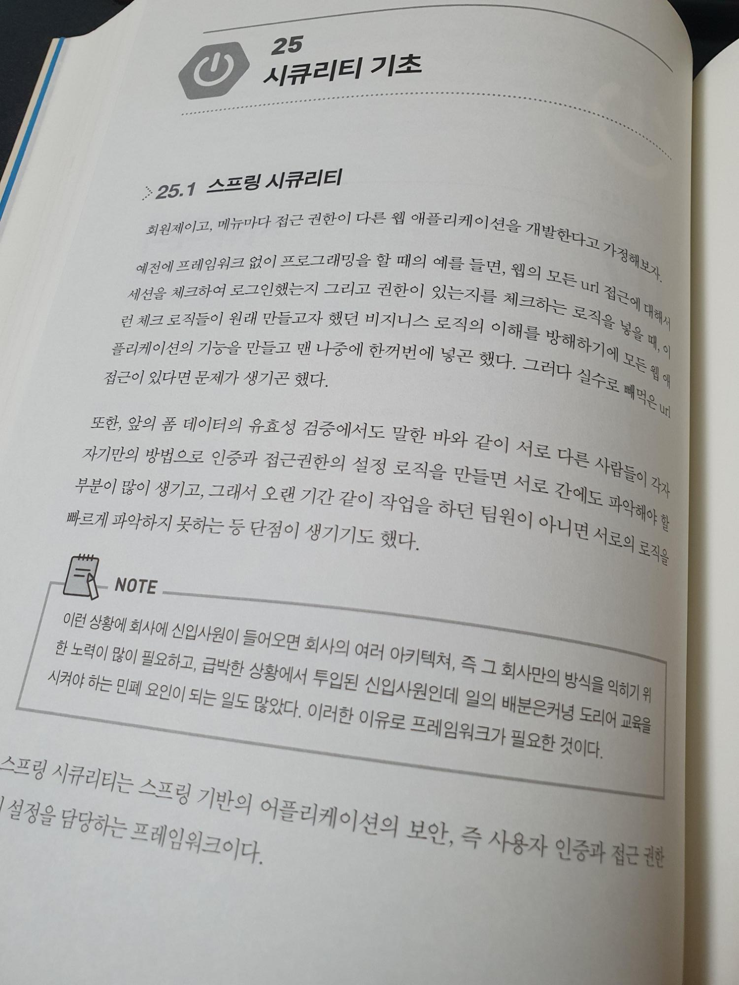 스프링 시큐리티를 통해 룰을 맵핑하거나 인증을 위한 예제들도 등장하게 됩니다. 스프링 시큐리티을 통해 ROLE을 맵핑하는 부분은 실무에서도 많이 쓰이는 부분이기 때문에 책을 통해 공부해보시는 것을 추천드립니다.