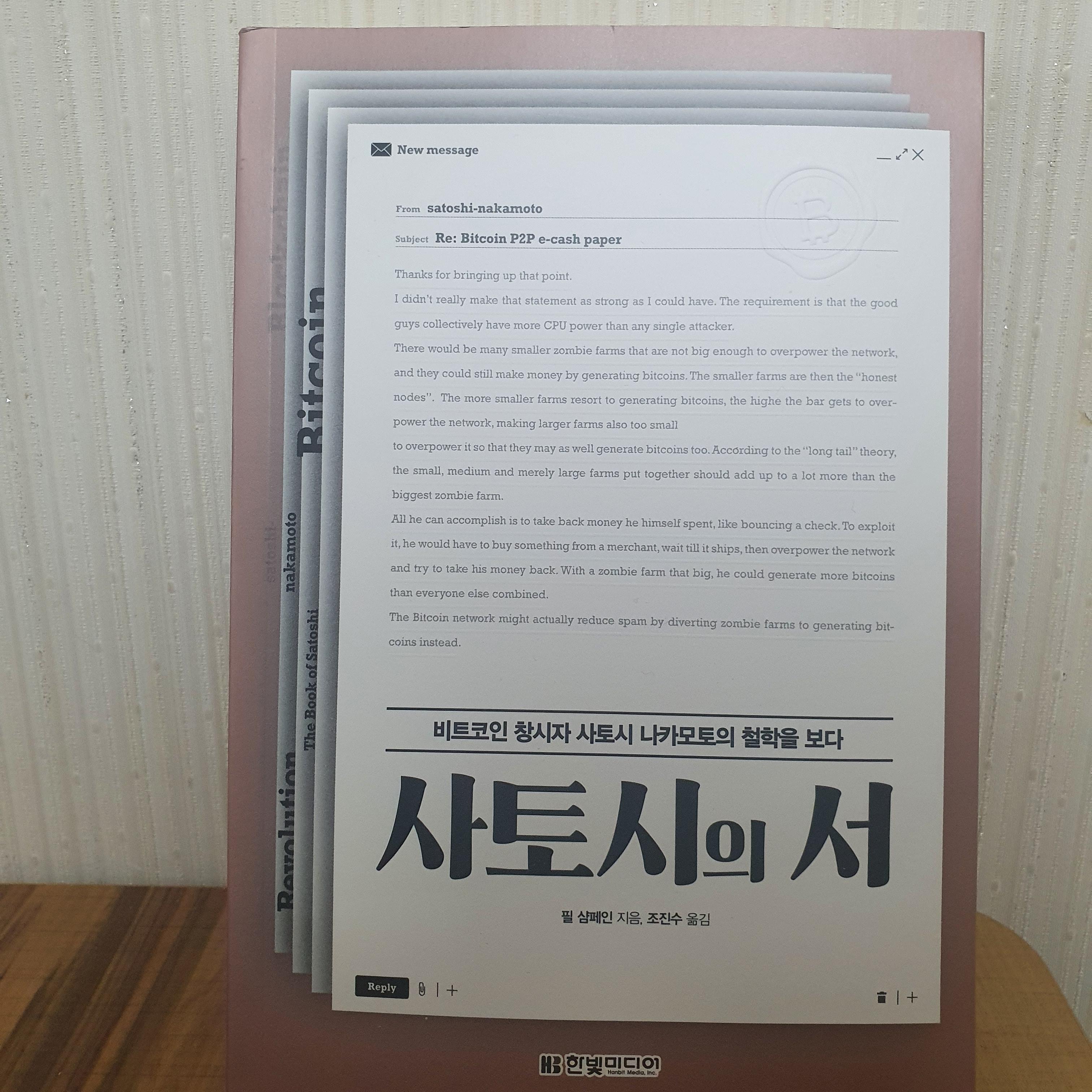 비트코인의 창시자 사토시 나카모토가 자취를 감추기 전까지 포럼과 이메일을 통해 공개적으로 또는 개인적으로 다양한 주제에 대해 여러 사람과 의견을 주고받은 내용을 모아 놓은 책
