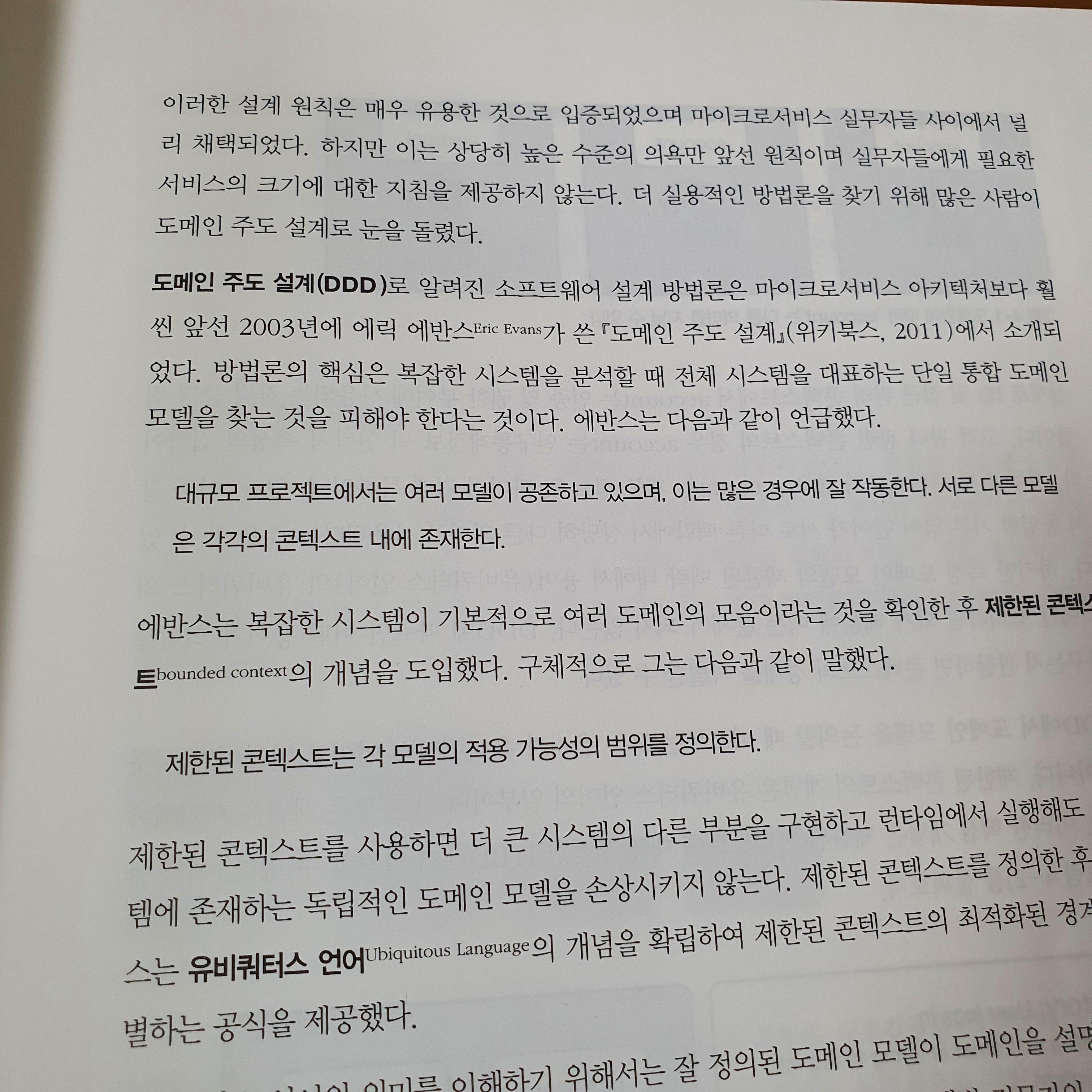 또한 마이크로서비스에 관련된 다양한 내용들을 접할 수 있다. MSA에 관련 된 내용 중 DDD(Domain Driven Design) 등에 대한 내용을 접하게 되는 책에서는 이런 부분들도 설명해주고 있다. 자세하게 설명해주는 부분은 아니지만 간단한 개념은 설명해주고 있다. 관련해서는 더 자세하게 공부하기 위해서는 이 책을 읽은 후에 따로 공부해야겠다라는 생각이 들었다.