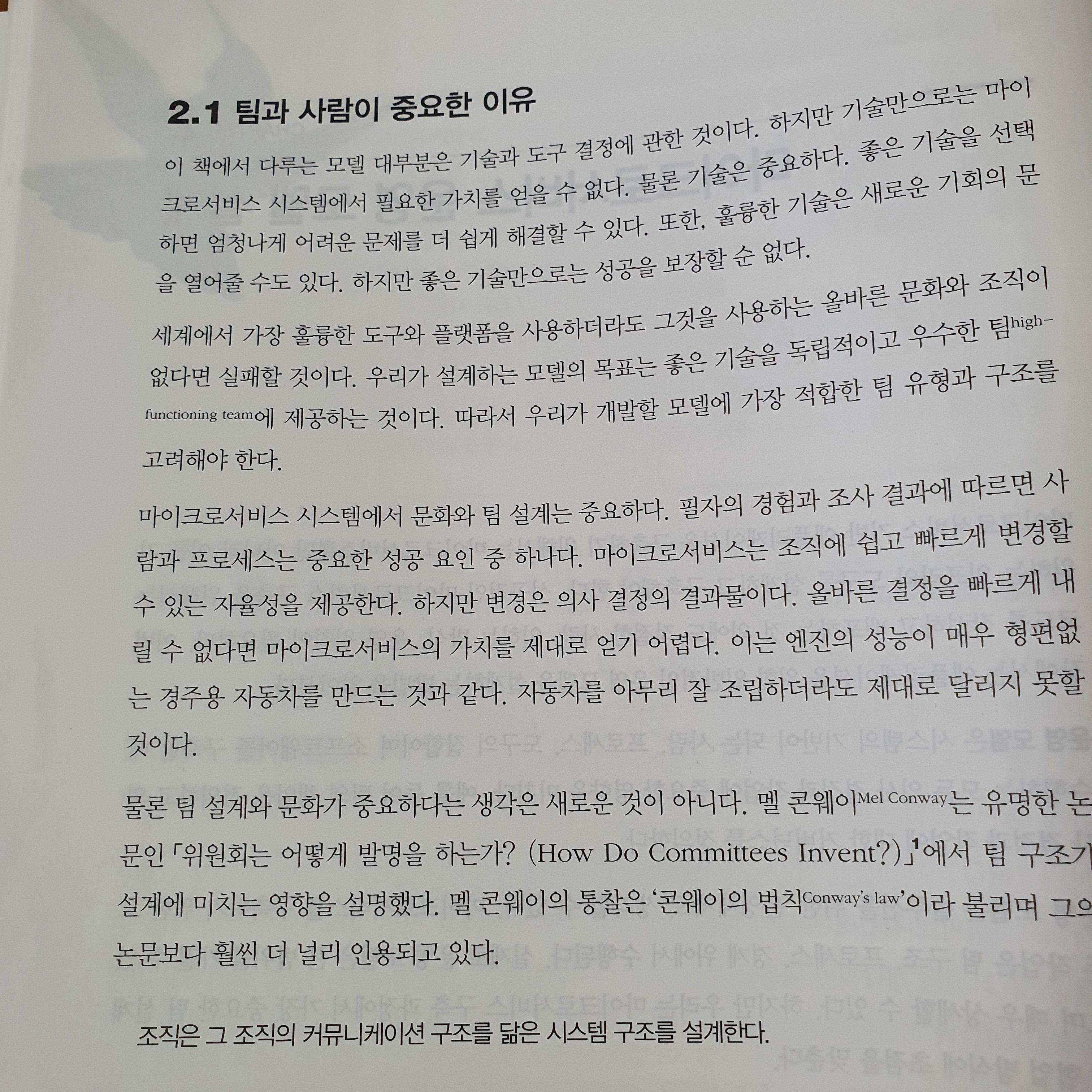 책을 읽다보니 아키텍처와 설계를 다루는 부분에서 마이크로서비스를 도입할 때 중요한 팀에 관한 이야기를 다루는 부분이 조금 신기하게 느껴졌다. 팀을 몇명으로 구성해야하는 지에 대한 내용도 눈이 띄었지만 팀과 사람이 가장 중요한 이유에 대해서 설명하는 부분에서 어떠한 기술보다 사람이 중요한 부분을 짚어주는 것 같아서 새로웠다.