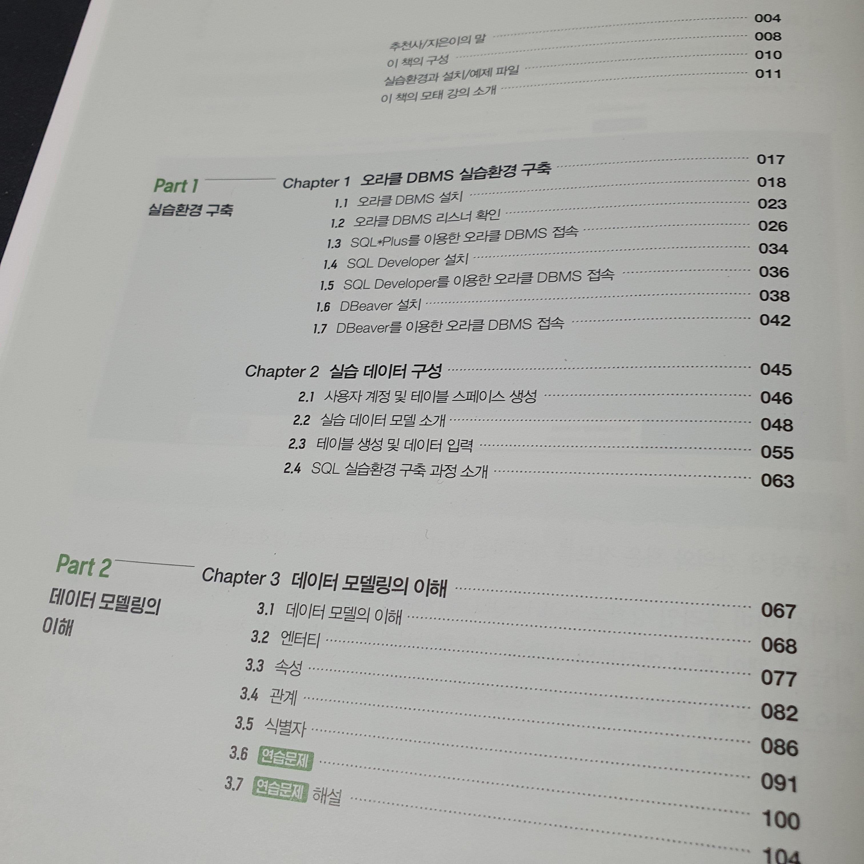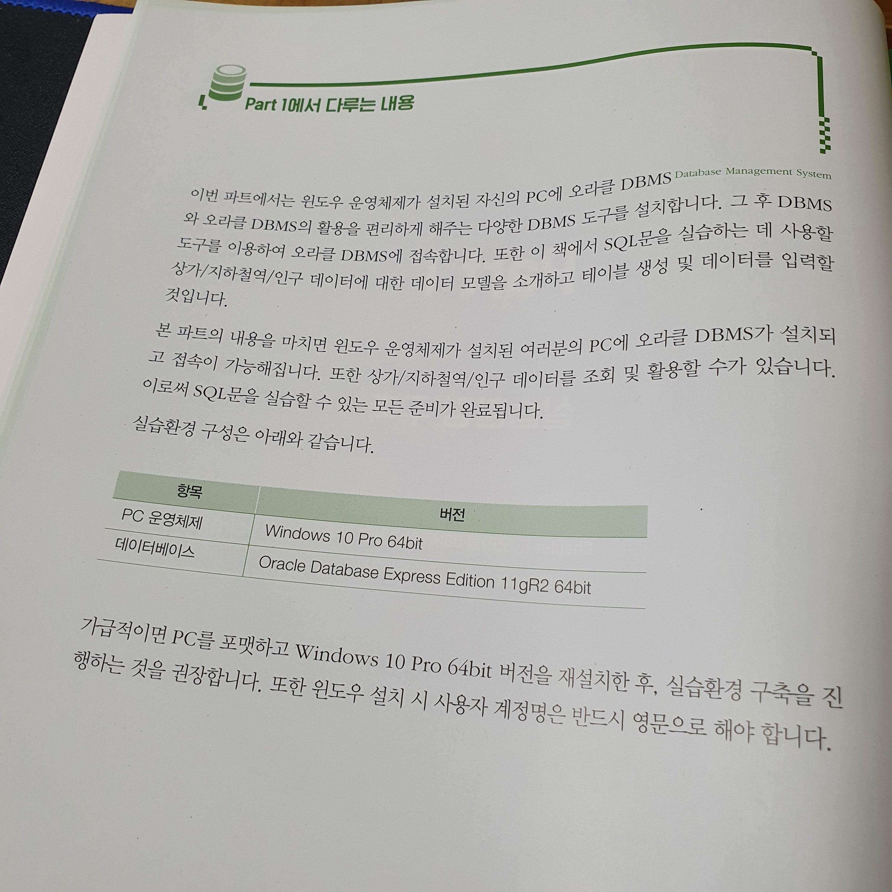 책에서는 Oracle DB와 Windows 10을 사용하고 있다. 자격증 시험과 연계되어 있다보니 macOS보다는 Windows10에서 실습하도록 되어 있는 것 같다. Oracle DB의 설치부터 시작해서 차근차근 책을 읽어내려 갈 수 있다. Oracle DB를 세팅하는게 생각보다 쉽지 않다는 것을 책을 읽으며 다시 한번 깨달았다.