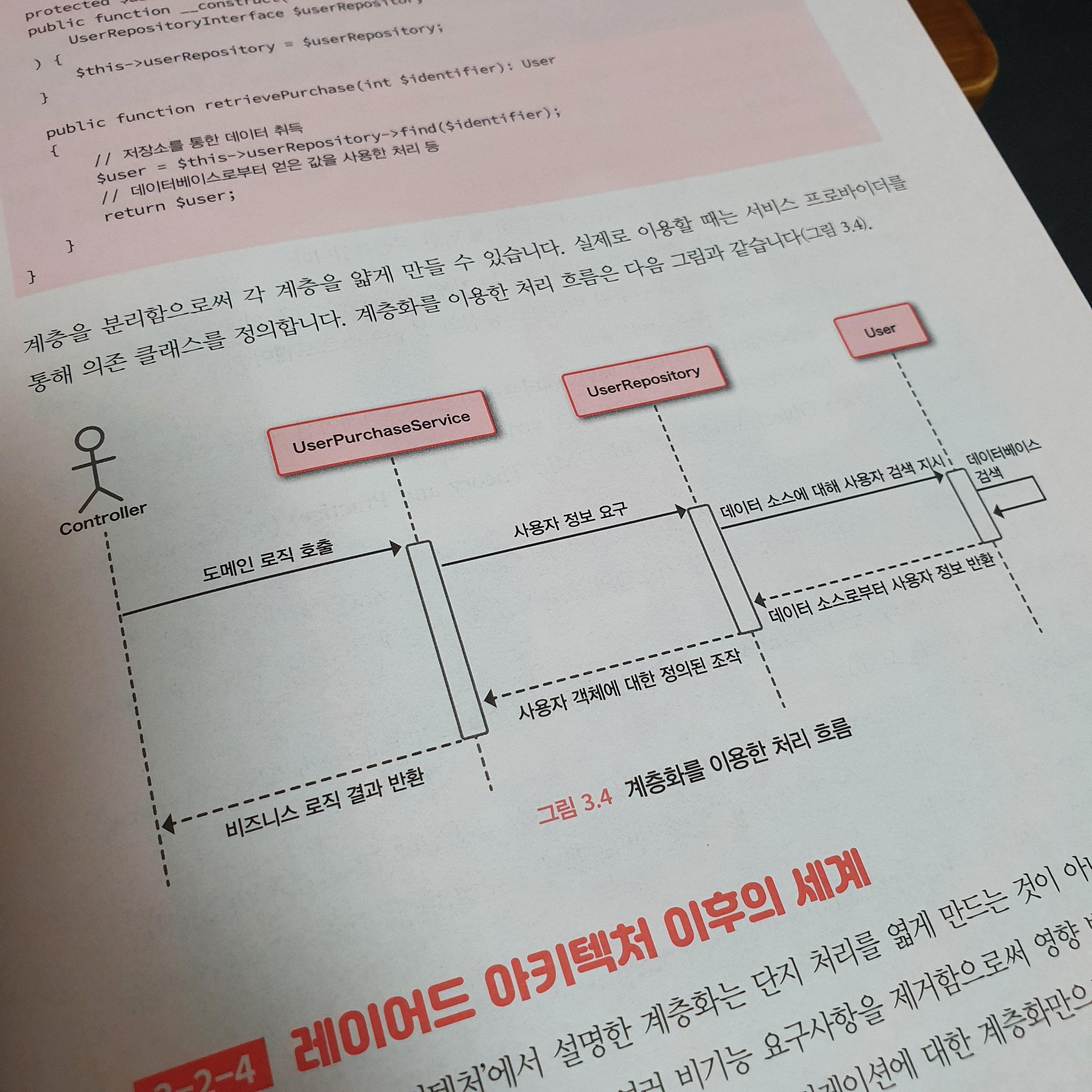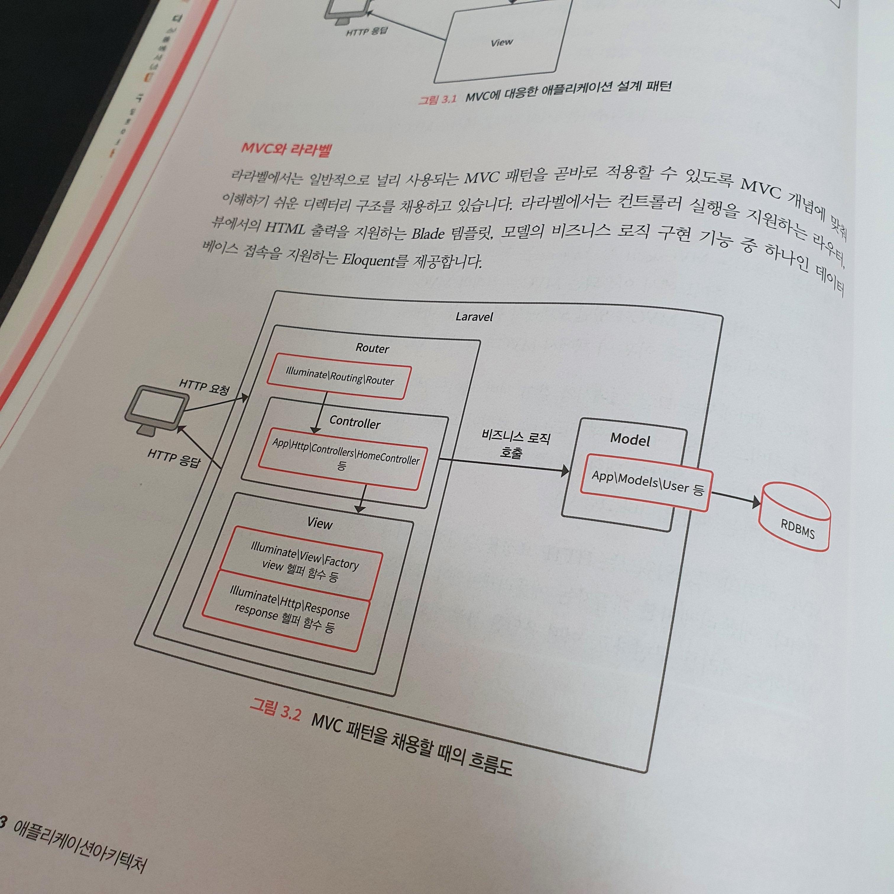 비슷한 부분들도 많이 나온다. 기존에 알고 있던 MVC 패턴을 사용한다고 한다. 라라벨은 MVC 패턴을 곧바로 적용할 수 있도록 MVC 개념에 맞춰 이해하기 쉬운 디렉토리 구조를 채용하고 있다고 한다. 기존의 MVC 내용을 이해하고 있다면 구조를 이해하는데는 그렇게 어렵지 않았다. 책을 보면 볼수록 개념에 대한 부분을 상세하게 설명해주고, 그림들도 다양하게 들어가 있고 쉽게 설명해주고 있어서 이해하는데 어려움이 없었다. 친철한 책이라는 느낌이 들었다.