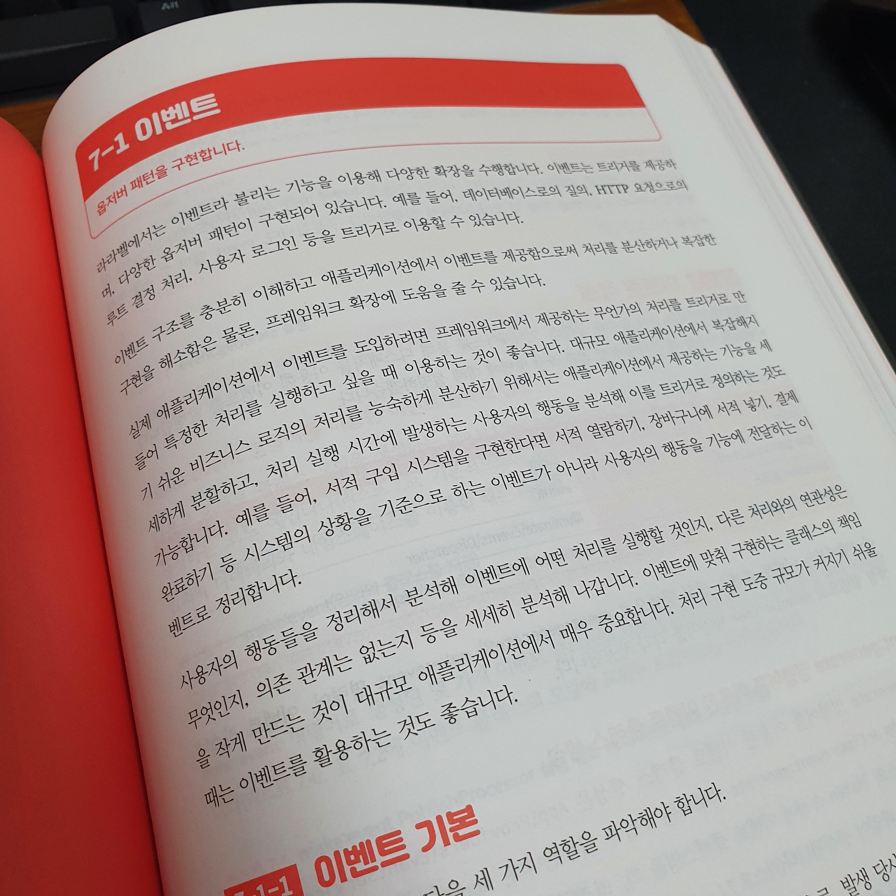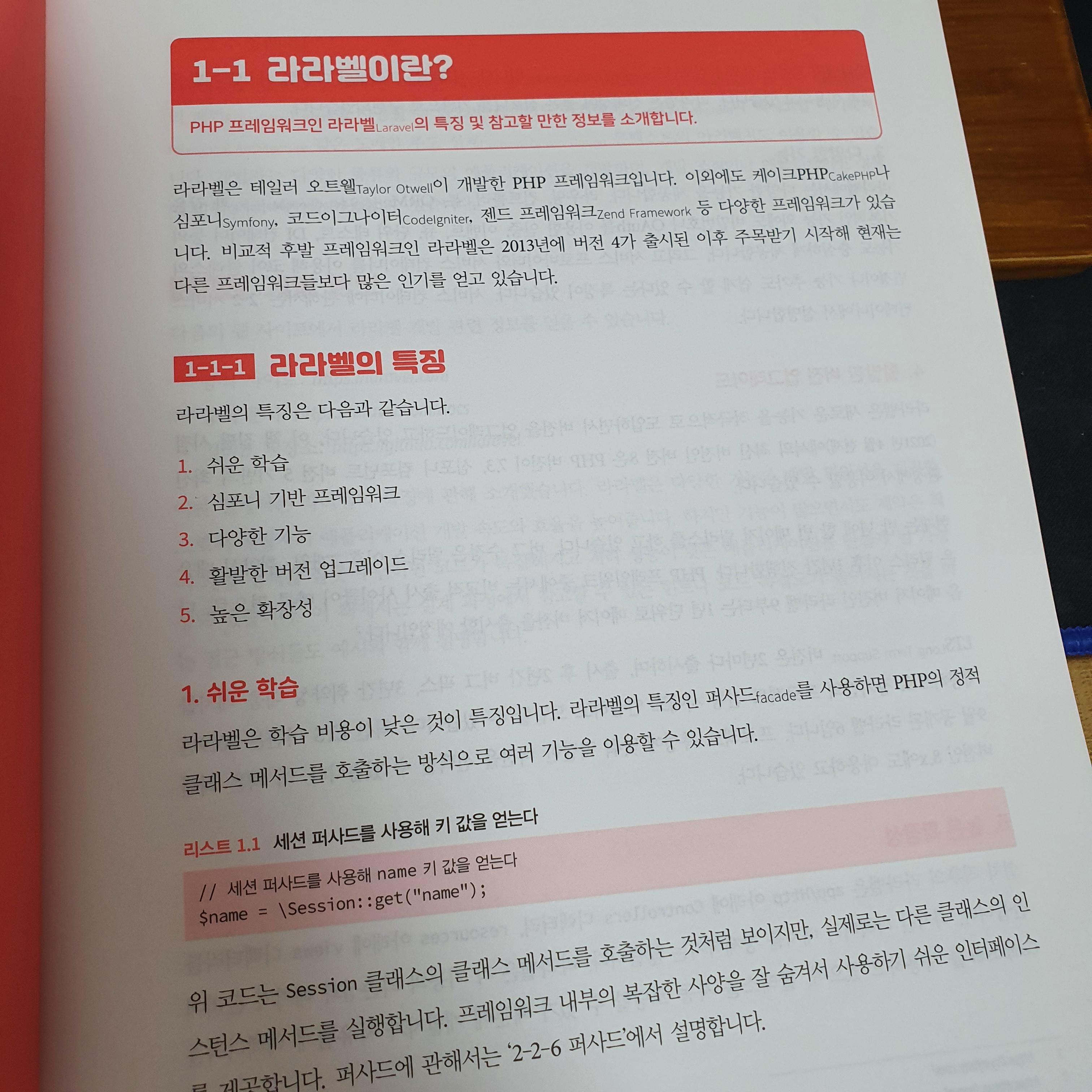 라라벨이라는 프레임워크를 처음 접하는 사람에게 추천하고 싶은 책이다. 상세한 내용과 다양한 예제(이벤트, Auth, DB)를 제공하면서 라라벨에 대한 내용을 습득할 수 있도록 도와주는 책이다. 상당히 친절하게 내용을 설명하고 있고 그림도 많아 이해하는데 어려움이 적다. 다만 책에 대부분이 붉은 색상으로 이루어져있다보니 눈이 조금 피로하다는 느낌이 들기도 했다.