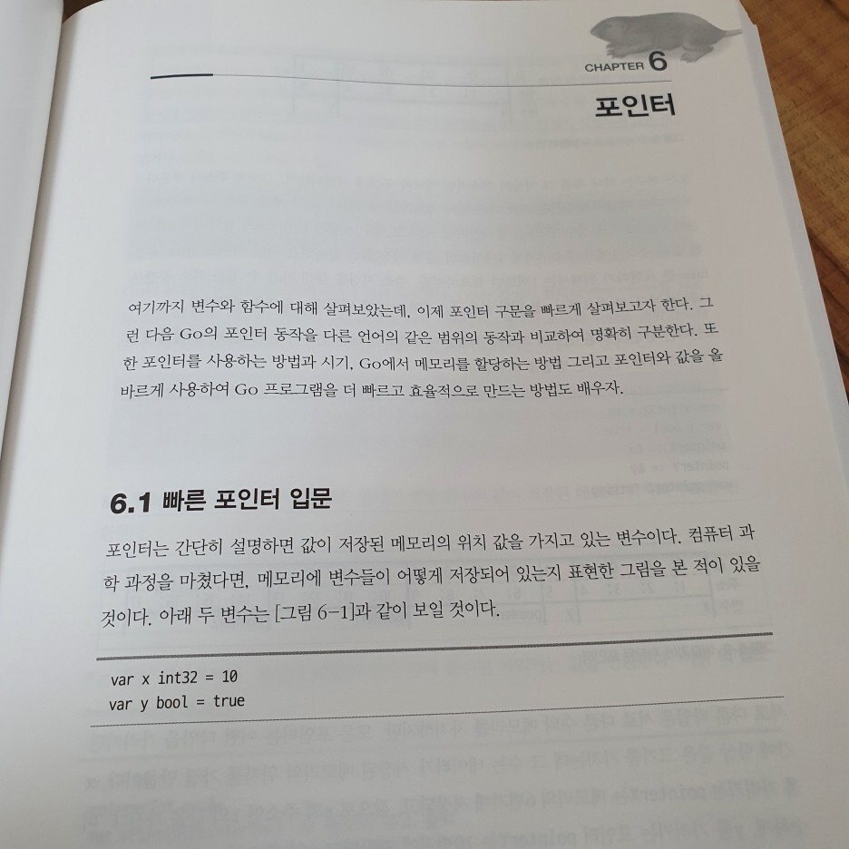 Go에서도 포인터를 사용한다. 포인터 구문 중 일부는 C와 C++에서 차용했다. 다만 Go는 가바지 컬렉터를 가지고 있기 때문에..(좋은 건 다 가지고 있네!) 메모리 관리에 대한 고통이 없다고 한다. 책을 읽으면 읽을 수록 Go라는 언어에 빠져드는 기분이 들었다.