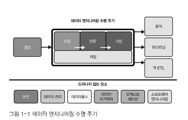 엔지니어링 개요 > 수명주기 > 설계 > 기술 선택 > 데이터 생성 > 저장 > 수집 > 변환 > 서빙 > 보안