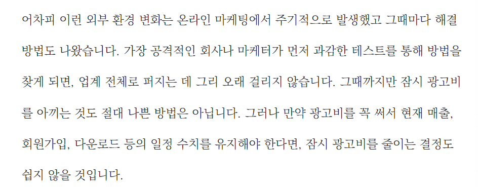 - 환경 변화가 안정이 되는 동안 광고비를 잠시 줄이면서 기다린다.