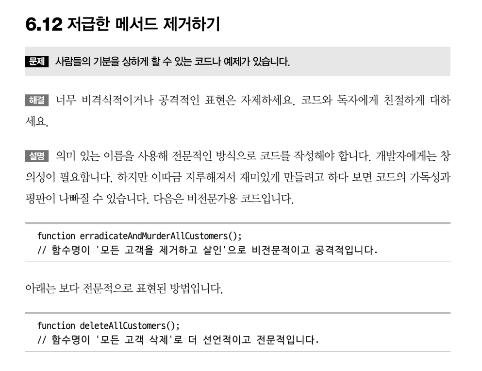 책 전반적으로 코드 클린을 다루고 있고 한번 쯤은 겪게 되는 코드에 대한 고민을 해보게 해주니 읽어보는 것을 추천한다. 나도 읽다보니 스스로를 계속 반성하게 되었다. 반성에게 그치는 것이 아니라 코드에도 반영한다면 내 코드를 보는 누군가에게 큰 도움이 되지 않을까 생각이 든다.