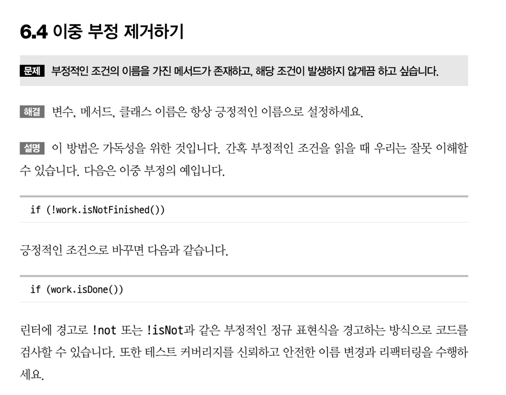 스스로 잘 지키지 못했던 부분 중 하나가 책에서 나와서 놀랐다. 코드를 짜다보면 이중 부정이 되는 경우가 간혹 있다. 그럴때 최대한 긍정조건으로 바꾸려고 하는 편이지만 또 쉽게 안될 때가(핑계..) 있기도 했었는데 다음부터는 조금 더 조심할 수 있도록 해야겠다는 생각이 들었다.