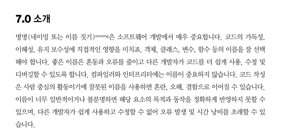 가끔 네이밍에 시간을 엄청 사용한다. GPT에게 의견을 묻기도, 팀원들에게 묻기도 한다. 그만큼 내가 지은 변수명이 명확할 수록 다른 사람이 내 코드를 봐도 이해하기 쉽기 때문이라는 생각이 커서 그런것 같다. 약어로 적은 부분을 확장하기도 하고 그렇지만 너무 긴 단어는 약어로 쓸 필요도 있어보이기도 한다.(협의 하에)