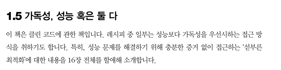 가독성과 성능 어떤 것을 더 우선으로 할 것인가에 대한 고민을 누구나 한번 쯤 해보지 않았을까? 책 초반에는 위와 같은 내용이 나온다. 관련해서는 '섣부른 최적화' 를보면 좋을 것 같다.