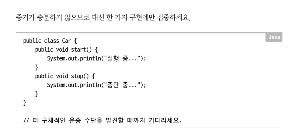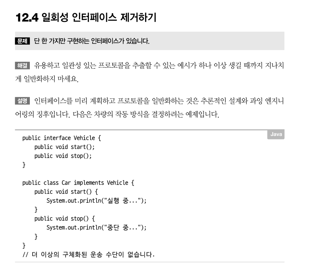 책을 보다가 뜨끔한 부분이 참 많았는데 인터페이스 부분도 그렇다. 언젠가 쓰겠지 라는 생각으로 인터페이스를 선언하고 사용하는데(테스트 하기도 편하기 때문에) 일회성을 제거하라고 되어 있어서 신기했다. 관점이 다를 수도 있겠구나 싶은 부분도 책에서는 존재한다. 책에서는 '모의 객체를 실제 객체로 대체하기' 에서 해당 내용을 다룬다.