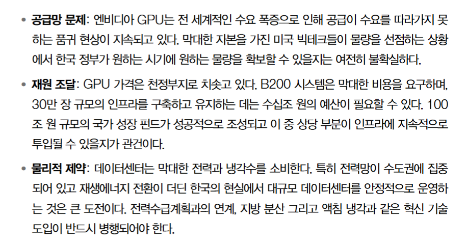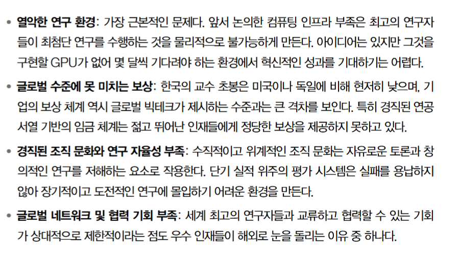 여러가지 문제들이 존재한다. 모델을 학습시키기 위한 GPU가 부족하고, 인력 또한 부족하다. GPU는 치킨회동을 통해 어떻게든 수급이 된다고 하더라도 인력의 유출이 꽤 심한편이다. 빅테크의 대우와 큰 차이가 있다. 금액적으로만 봐도 한국에서 연구를 하는것보다 해외에서 연구를 하는것이 이득이라고 생각이 들 정도로 차이가 심하다. 또한 국가주도가 아닌 민간주도로 이루어지고 있다는 점이다. 독파모(독자 파운데이션 모델)에 참여하는 기업들은 민간 기업이다. 기업 입장에서는 돈이 되지 않는 사업을 하고 싶어하지 않는다. 손해이기 때문이다.