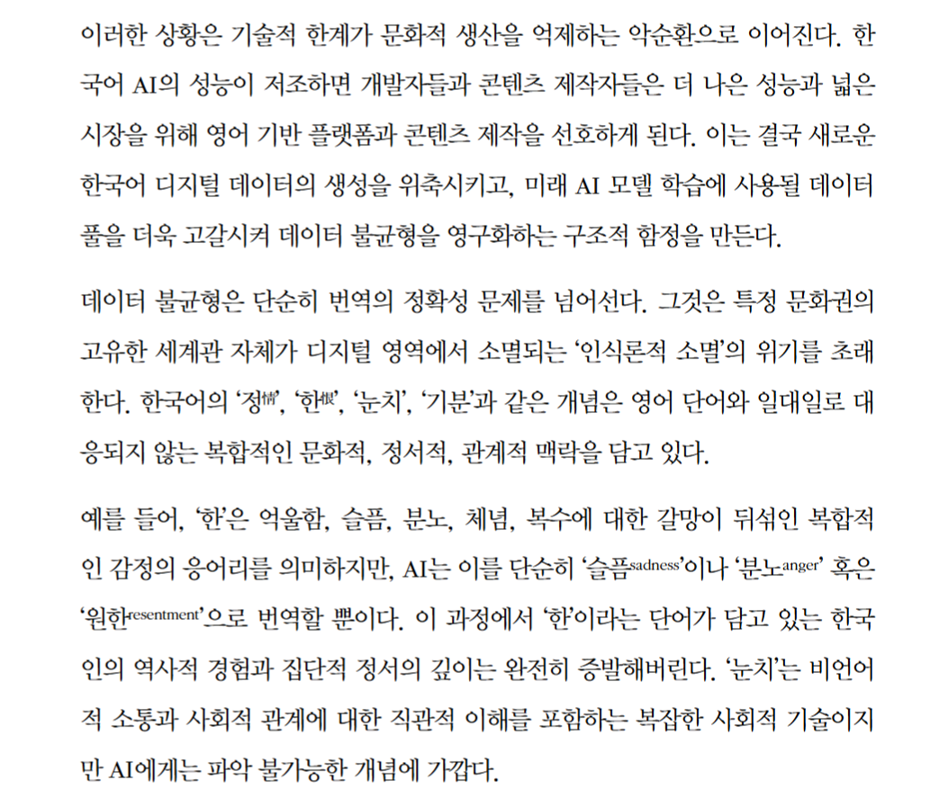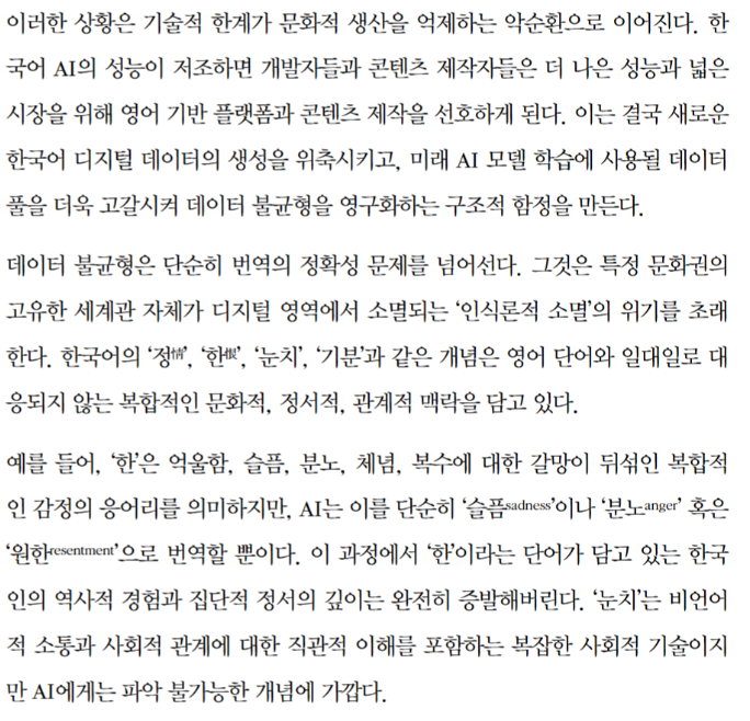 책의 내용은 어떤 관점에서 보느냐에 따라 다르게 해석이 가능할것 같다. AI가 '한'을 학습해야할 필요가 있을까? 라는 의문도 들었다. '한'이라는 복합적인 내용에 대한 번역이 필요하다면 그에 맞게 수요가 있을 것이라는 생각이다. 같은 영화를 AI와 사람에게 번역하였을 때 누군가는 AI를, 또 다른 누군가는 사람이 번역한 자막을 선택할 수 있는 시대가 될수도 있다고 생각이 든다. 소비자의 입장에서는 선택권이 더욱 많아질 수 있다는 점에서는 좋은 점으로 생각된다.